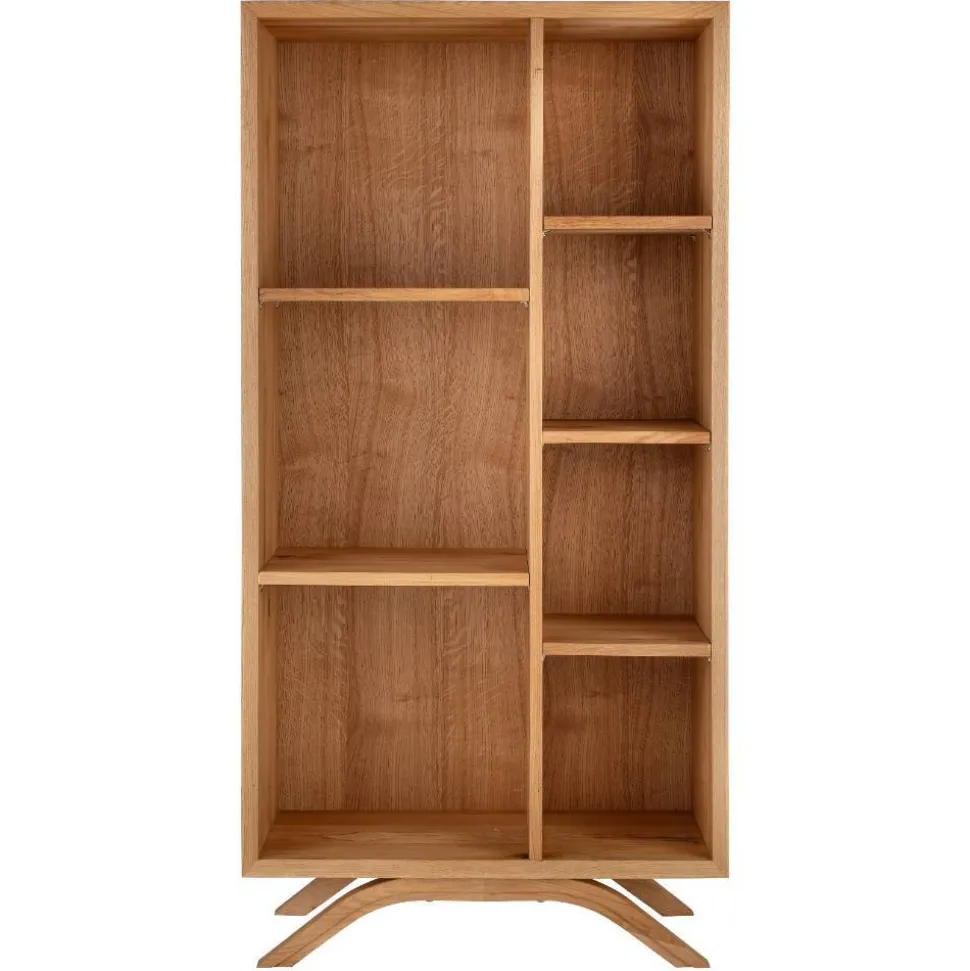 Mit fünf Einlegeböden bietet das Regal eine raffinierte Innenstruktur: Drei größere Fächer auf der linken Seite und vier kleinere rechts schaffen Platz für Bücher, Deko oder Alltagsgegenstände. Die stabile Unterkonstruktion aus Massivholz mit vier formschön gestalteten Füßen sorgt für sicheren Stand – dennoch wird empfohlen, das Möbel zusätzlich an der Wand zu fixieren, um maximale Kippsicherheit zu gewährleisten.