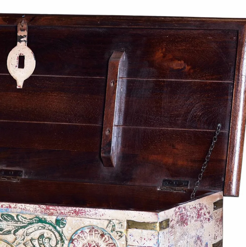 Gefertigt aus massivem Mangobaumholz, garantiert die Truhe „Akeno“ nicht nur einen robusten und langlebigen Charakter, sondern auch ein Möbelstück, das durch seine natürliche Holzmaserung und authentische Ausstrahlung begeistert. Die Oberfläche wurde von Hand lackiert und liebevoll beschnitzt, sodass jedes Exemplar ein echtes Unikat darstellt. Feine bronzefarbige Metall-Applikationen zieren das Möbelstück und unterstreichen seine charmante Optik. Die kunstvollen, ornamentalen Muster verleihen der Truhe eine ganz besondere Note und machen sie zu einem echten Hingucker in Ihrem Zuhause.