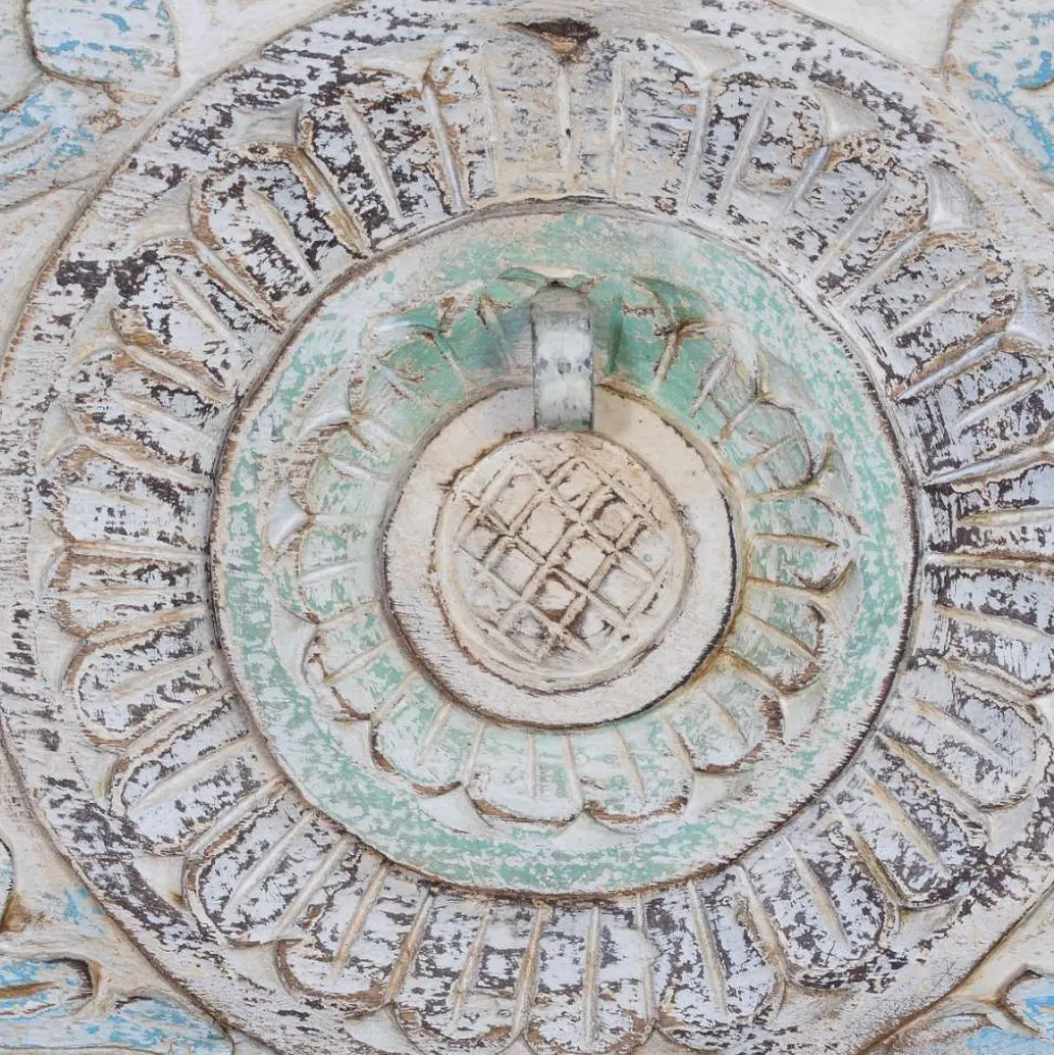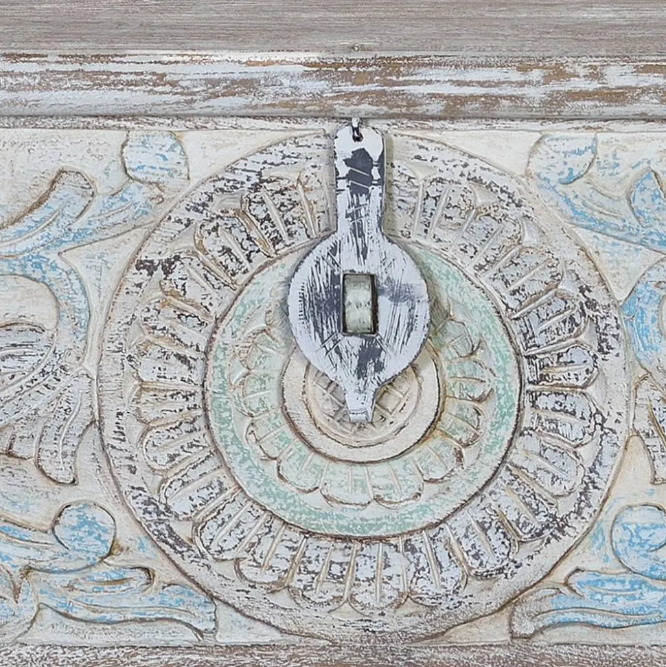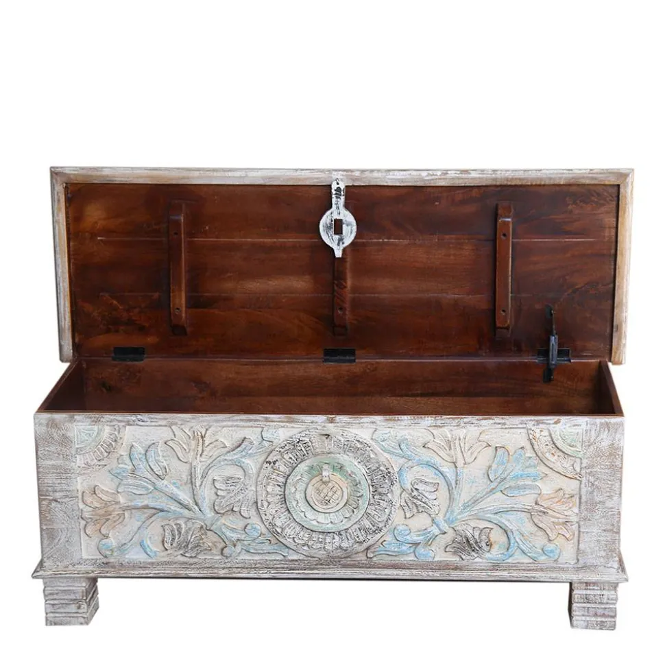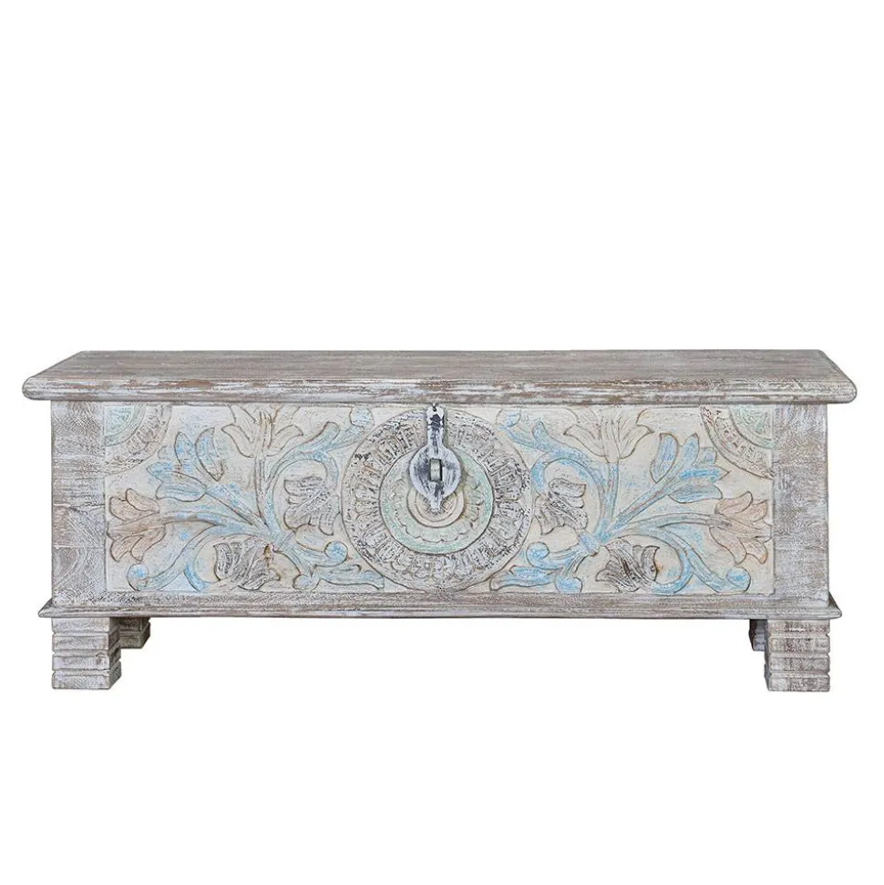 Gefertigt aus hochwertigem Mangoholz, überzeugt die Truhe mit einer robusten Bauweise und einer natürlichen, lebendigen Holzstruktur. Die handbemalten Oberflächen unterstreichen den individuellen Charakter jedes einzelnen Exemplars, während die plastischen Schnitzereien auf der Front mit floralen Motiven und Ornamenten kunstvolle Akzente setzen. Diese detailreiche Verarbeitung macht jede Truhe einzigartig und verleiht ihr einen unverwechselbaren Charme.