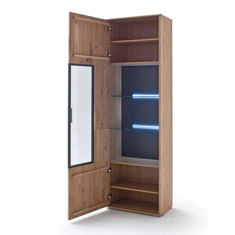 - Hergestellt aus Asteiche Massivholz (Front), MDF (Absetzungen), Spanplatte (Korpus) und Glas