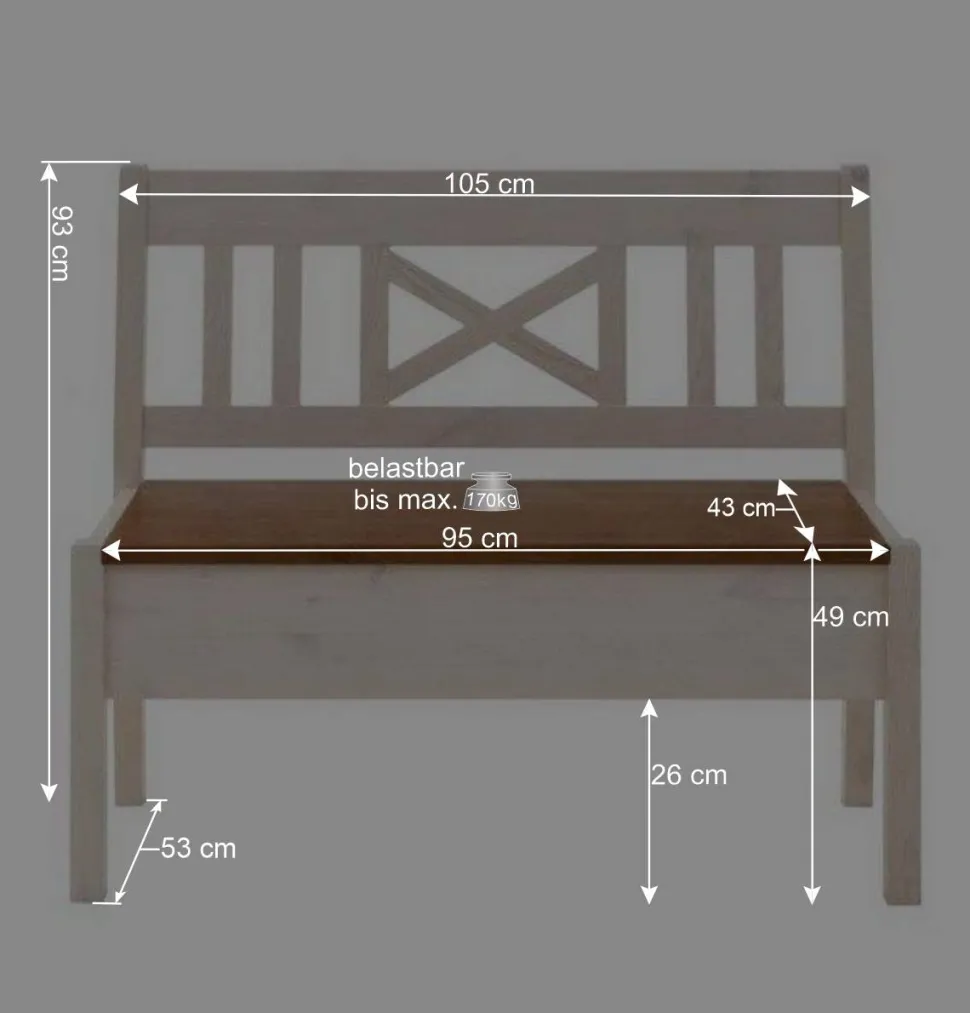 Mit einer Breite von 105 cm, einer Höhe von 93 cm und einer Tiefe von 53 cm bietet Sitzbank „Barlad“ ausreichend Platz für bequemes Sitzen. Die Sitzhöhe von ca. 49 cm und die Sitztiefe von 43 cm sind perfekt für den Essbereich konzipiert, um eine angenehme Sitzposition zu gewährleisten. Die Sitzfläche dient gleichzeitig als Klappe zu einer praktischen Truhe, die Platz für Kissen und Decken bietet. So haben Sie immer eine schnelle und platzsparende Lösung zur Hand, um Ihre Wohntextilien zu verstauen.