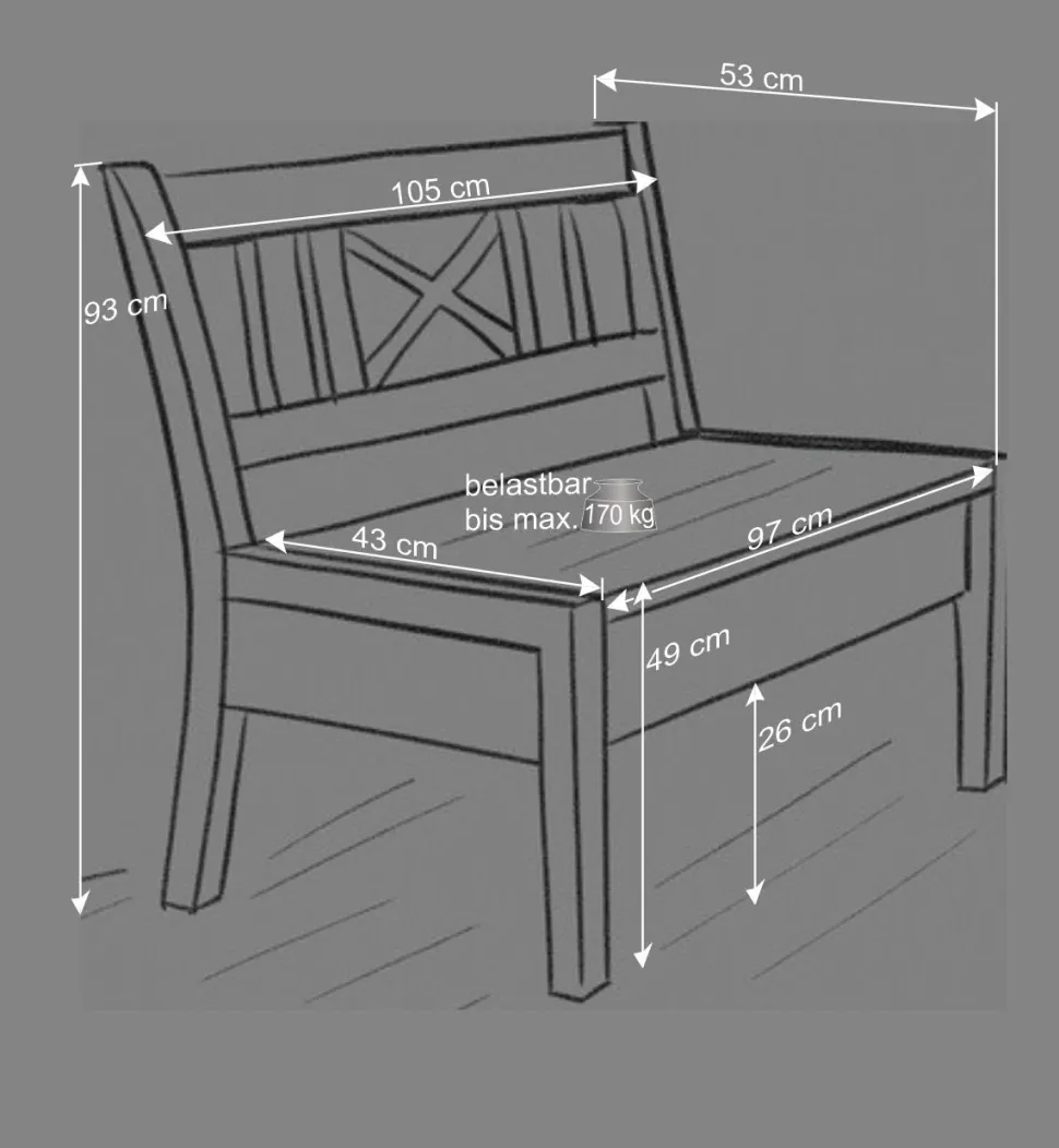 Die hochklappbare Sitzfläche offenbart eine großzügige Truhe, die als praktischer Stauraum dient. Ideal für Decken, Kissen, Schuhe oder andere Utensilien, die Sie stilvoll und griffbereit aufbewahren möchten. Die Bank ist 105 cm breit und bietet mit einer Sitzbreite von ca. 97 cm bequem Platz für zwei Personen. Dank des massiven Vierfußgestells trägt sie bis zu 170 kg und steht absolut stabil – ein Möbelstück, das mit Ihnen durchs Leben geht.