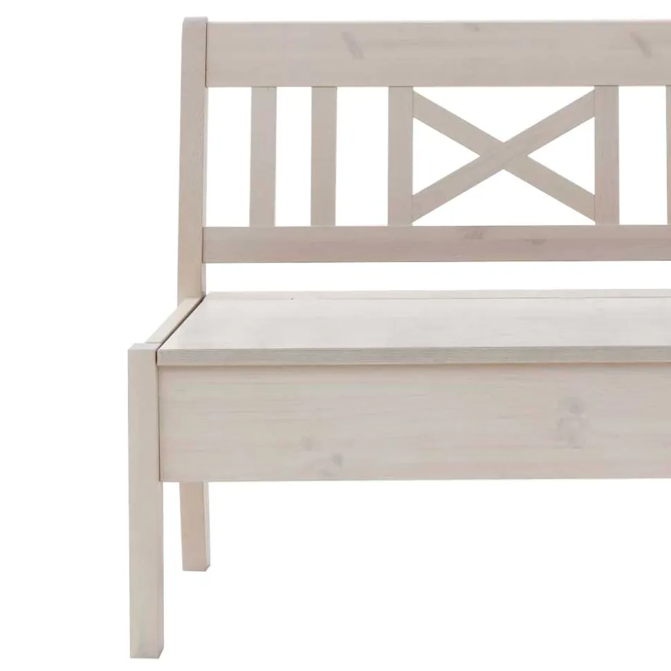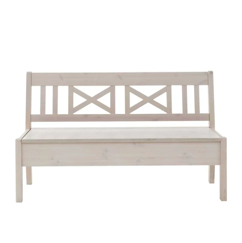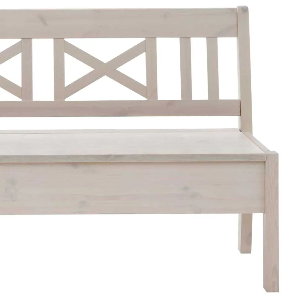 Gefertigt aus massiver nordischer Kiefer, bietet diese Bank nicht nur eine außergewöhnliche Langlebigkeit, sondern auch einen einzigartigen Charakter. Die nordische Kiefer zeichnet sich durch ihre Robustheit und Widerstandsfähigkeit gegenüber Witterungseinflüssen aus, was sie ideal für langlebige Möbelstücke macht. Die Oberfläche der Bank ist weiß gebeizt und lackiert, wodurch die natürliche Maserung des Holzes sanft durchscheint und einen edlen Glanz erhält.