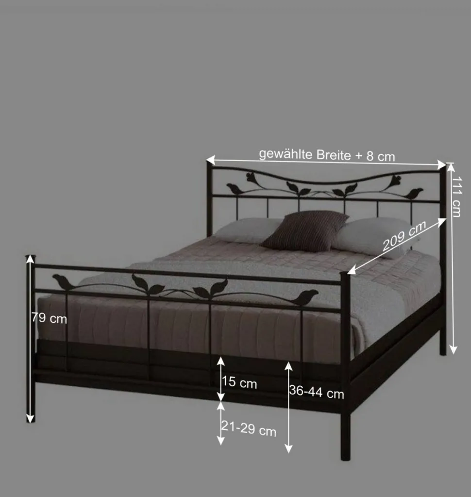 Das kunstvoll gestaltete Kopf- und Fußteil des „Briotova“ beeindruckt mit floralen Verzierungen, die dem Bett einen romantischen und zugleich klassischen Look verleihen. Mit einer Höhe von 111 cm am Kopfteil und 79 cm am Fußteil schafft es eine harmonische Balance zwischen Ästhetik und Komfort.