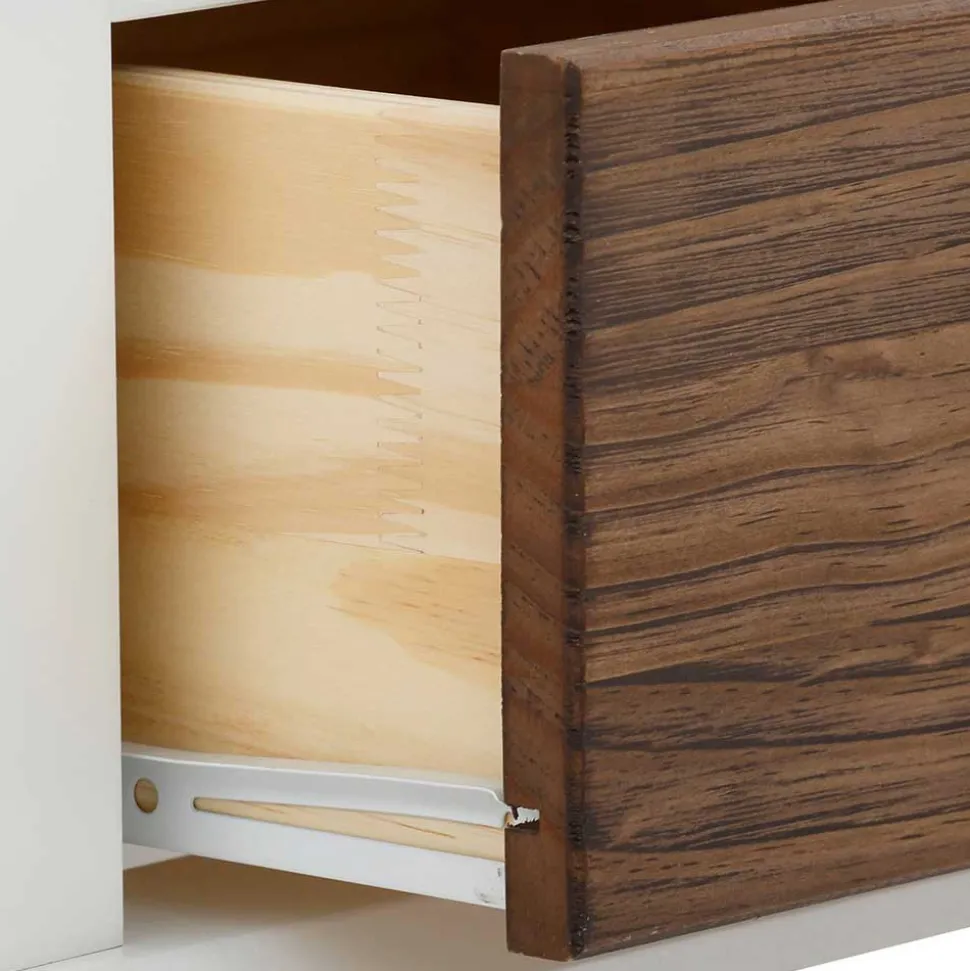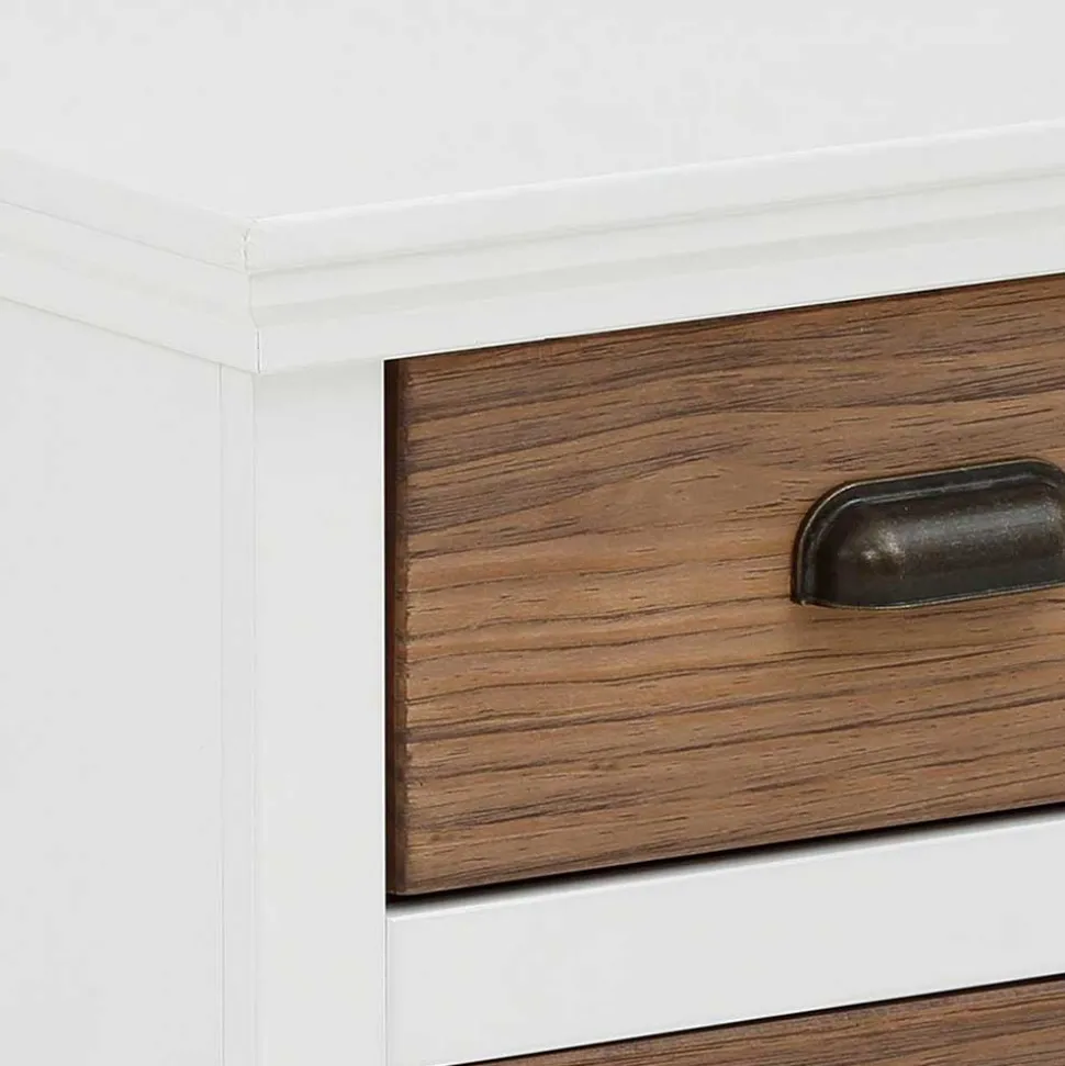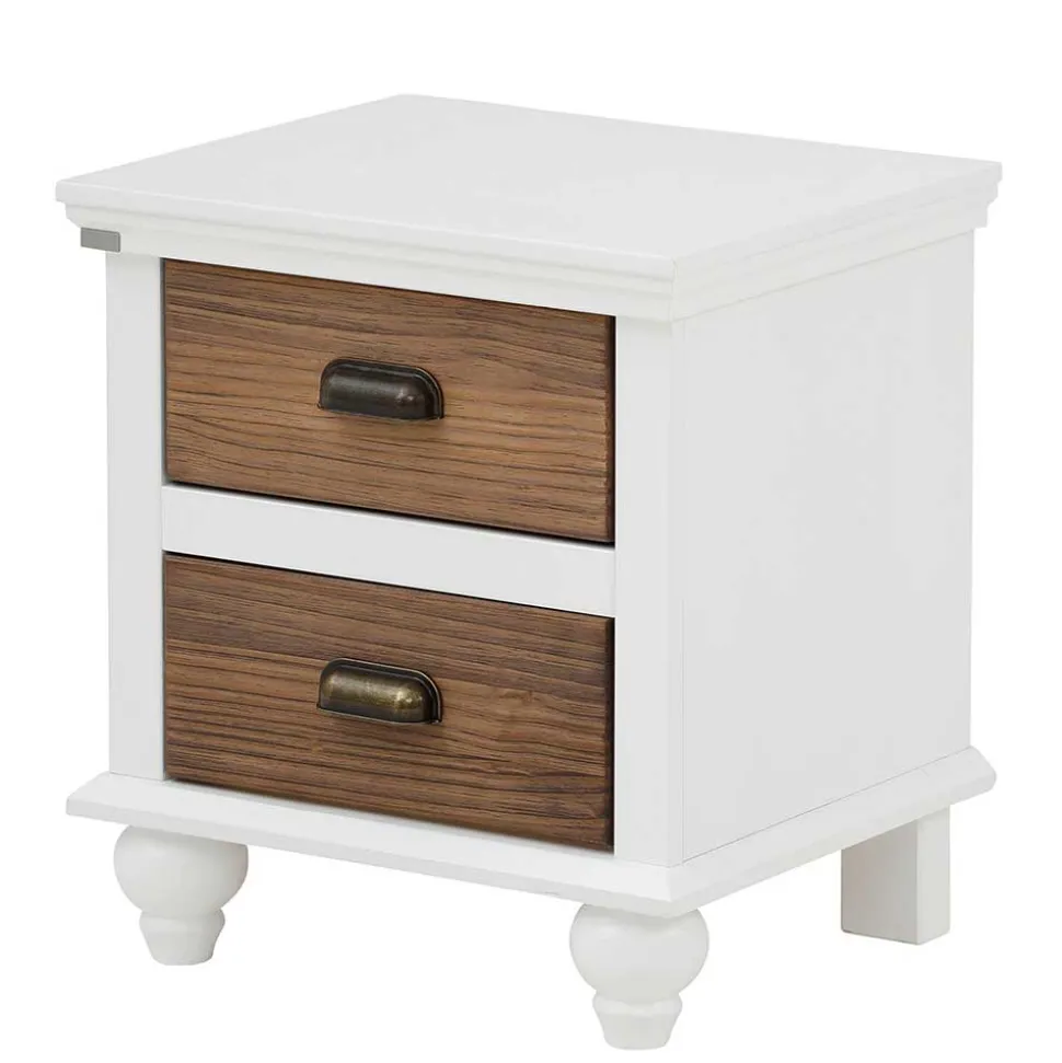 Die Nachtkommode bietet mit zwei geräumigen Schubladen ausreichend Platz für Ihre Utensilien. Die Schubladenfronten in warmem Kiefernholz Braun setzen einen schönen Kontrast zum weißen Korpus und verleihen der Kommode ihren einzigartigen Charme. Dank der Metallauszüge gleiten die Schubladen sanft und zuverlässig, während die Muschelgriffe aus Altmessing einen zusätzlichen Hauch von Nostalgie hinzufügen.