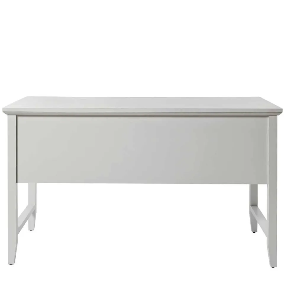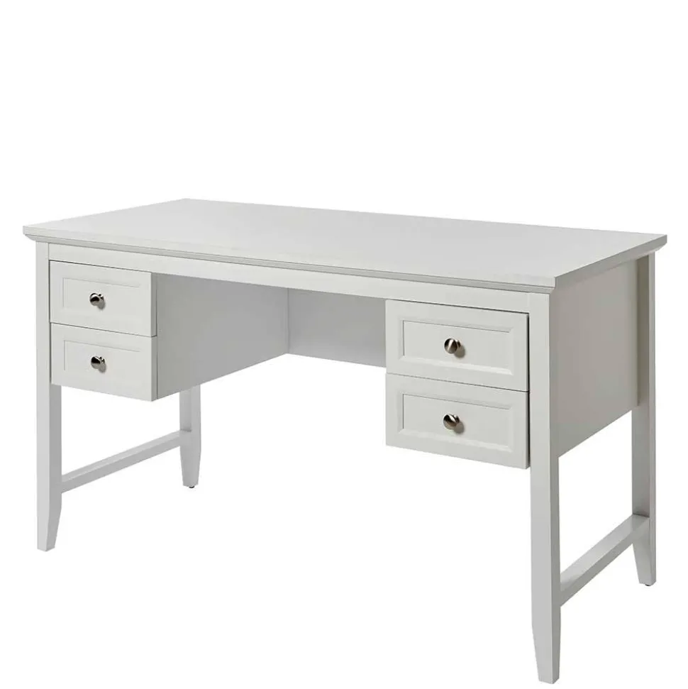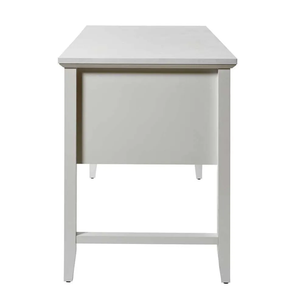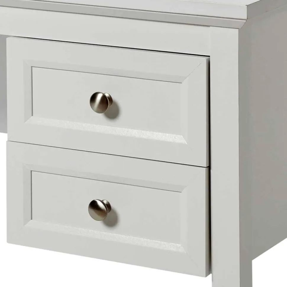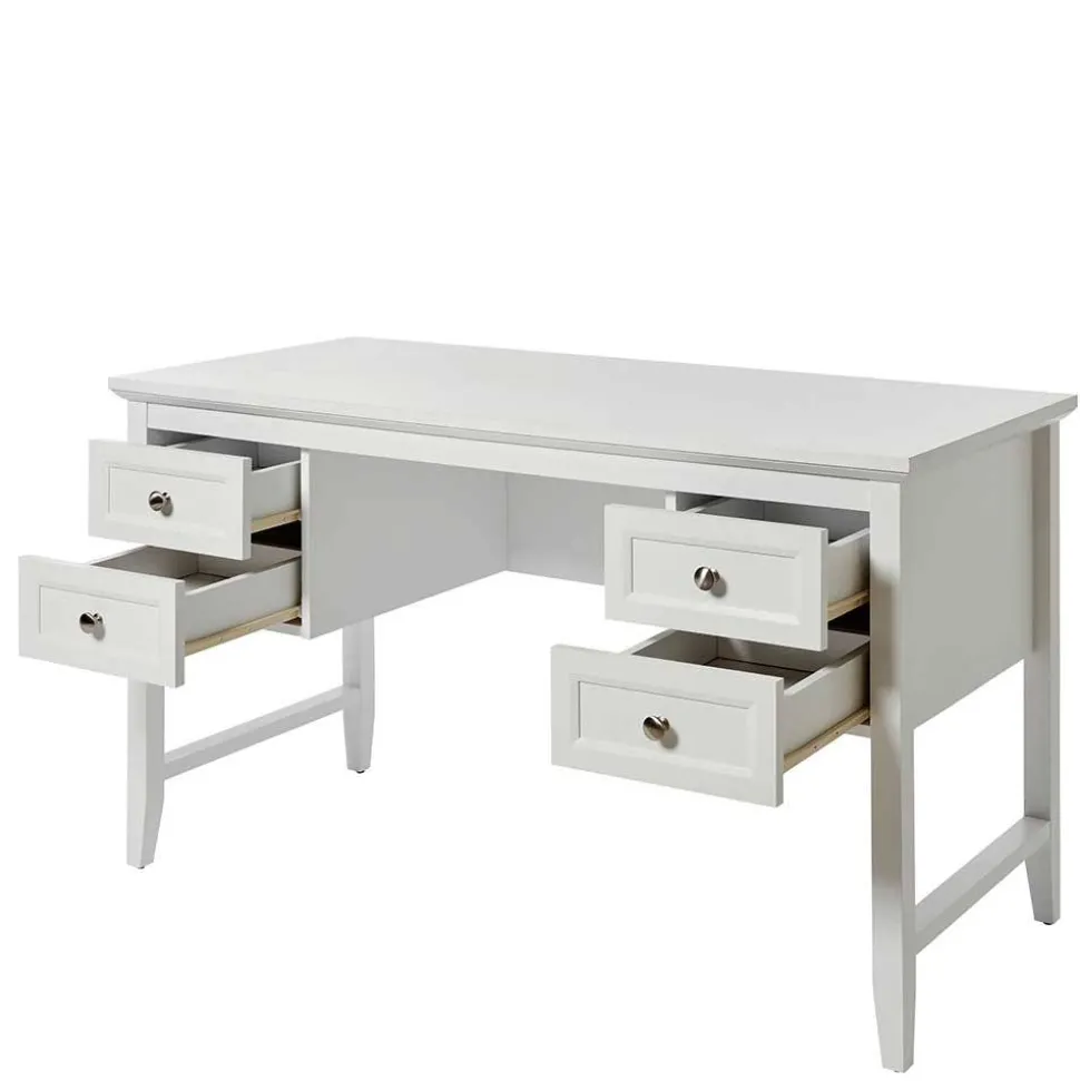Der Schreibtisch „Carter“ vereint auf geschmackvolle Weise zeitlose Schlichtheit mit dem unverwechselbaren Charme des modernen Landhausstils. Mit seinen klaren Linien und den dekorativen Schubladenfronten in Kassetten-Optik wird er zu einem echten Hingucker in Ihrem Arbeitsbereich. Abgerundet wird das Design durch formschöne Knopfgriffe aus silberfarbenem Metall, die dem Möbelstück eine elegante Note verleihen und es gleichzeitig funktional unterstreichen.