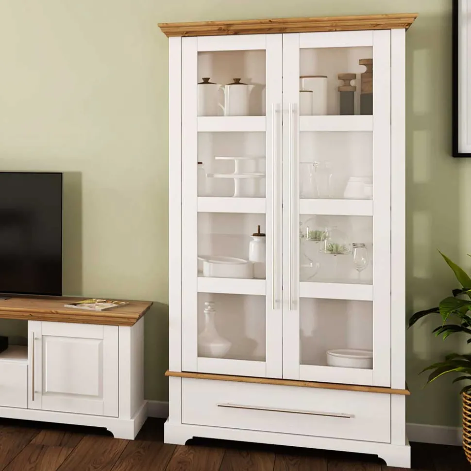 - Formschöne Vitrine in Weiß und Kiefer Honigfarben