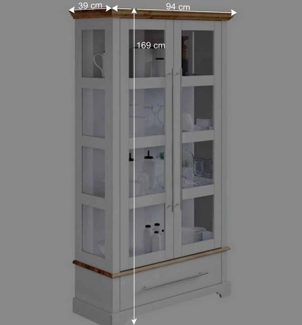Mit Maßen von 94 cm Breite, 169 cm Höhe und 39 cm Tiefe bietet die Vitrine reichlich Stauraum. Die formschön gefrästen Deck- und Zwischenplatten verleihen dem Möbelstück eine elegante Note. Hinter zwei Türen mit Sprossen-Optik und Glaseinsätzen befinden sich drei Einlegeböden, die jeweils bis zu 8 kg belasten werden können. Die geräumige Schublade mit einem praktischen Metallauszug bietet zusätzlichen Stauraum für Ihre Utensilien.