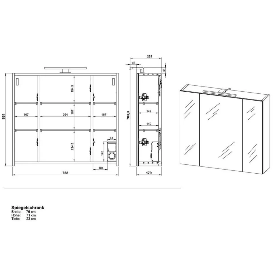 - Der Spiegelschrank (75,8×66,1×17,9 cm, ca. 21,18 kg): Drei Spiegeltüren bieten eine großzügige Spiegelfläche, während verstellbare Glasböden innen flexible Stauraummöglichkeiten schaffen. Besonders praktisch: Eine integrierte Schalter- und Steckdosenkombination für Rasierer oder elektrische Zahnbürsten.
