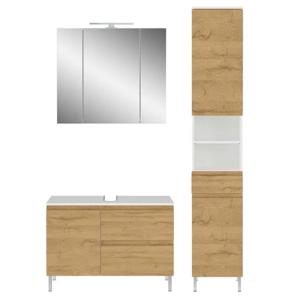Die harmonische Kombination aus edler Wildeiche-Optik und strahlendem Weiß verleiht dem Badezimmer eine einladende und moderne Atmosphäre. Während die weiße Melaminbeschichtung für eine besonders pflegeleichte und widerstandsfähige Oberfläche sorgt, besticht die Holzoptik durch ihre natürliche Wärme. Die tiefgezogenen Kanten verstärken den hochwertigen Eindruck und unterstreichen die makellose Verarbeitung dieser stilvollen Badmöbel.