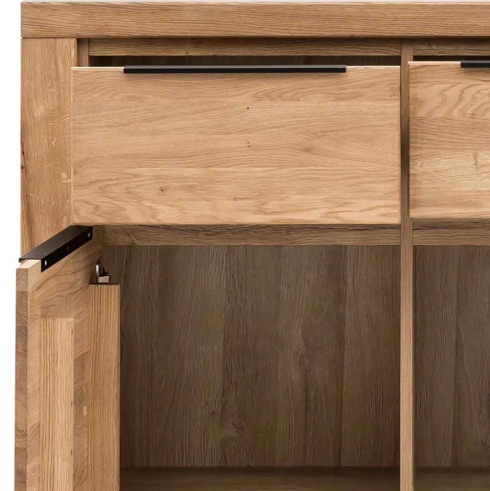 Die Fronten dieses Möbelstücks bestehen aus massivem Eichenholz, einem der robustesten und langlebigsten Holzarten. Eichenholz überzeugt nicht nur durch seine beeindruckende Strapazierfähigkeit, sondern auch durch seine individuelle Maserung, die jedem Möbelstück eine einzigartige Note verleiht. Die natürliche Geöltheit der Massivholz-Oberfläche schützt und betont gleichzeitig das charakteristische Erscheinungsbild des Holzes.