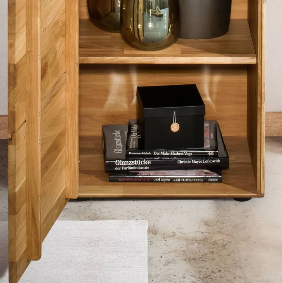 Die Wildeiche besticht durch ihre lebhafte Maserung und ihre außergewöhnliche Robustheit. Jedes Stück Holz erzählt seine eigene Geschichte, was jede Kommode Feanor zu einem Unikat macht. Die natürlich geölte Oberfläche betont nicht nur die Schönheit des Holzes, sondern schützt es gleichzeitig vor Feuchtigkeit und Verschleiß. Wildeiche ist bekannt für ihre Langlebigkeit und ihre positive Wirkung auf das Raumklima, da sie auf natürliche Weise die Luftfeuchtigkeit reguliert.
