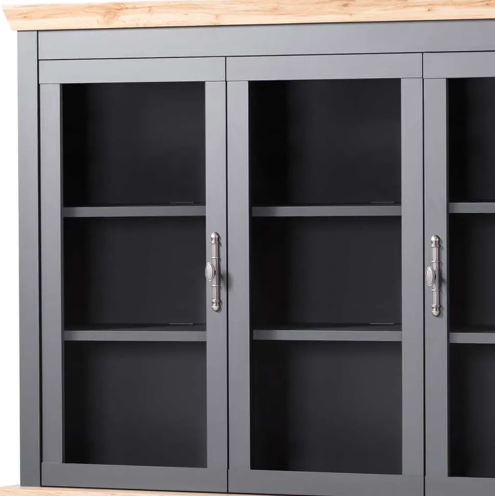 Die oberen beiden Türfronten sind mit Glaseinsätzen ausgestattet, die Ihr Geschirr und Ihre Dekorationsobjekte perfekt zur Geltung bringen. Innen finden Sie oben jeweils zwei dreifach verstellbare Einlegeböden, die Ihnen maximale Flexibilität bei der Aufbewahrung bieten. Optional können Sie diese Einlegeböden auch mit energiesparender LED-Beleuchtung bestellen, um eine stimmungsvolle Atmosphäre zu schaffen.