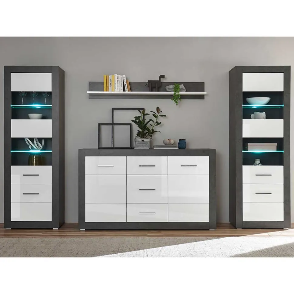 Gefertigt aus robustem MDF für die Fronten und langlebiger Spanplatte für die Korpora, verspricht diese Wohnkombination Langlebigkeit und Stabilität. Die Fronten sind melaminbeschichtet in einem strahlenden Weiß Hochglanz, welches sich harmonisch mit den Rahmen, Korpora und Innendekoren in Beton Grau kombiniert. Diese Farbzusammenstellung verleiht jedem Wohnraum eine moderne und doch wohnliche Atmosphäre.