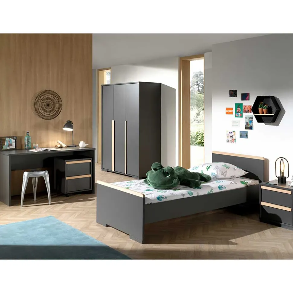 Dieses fünfteilige Einrichtungsset umfasst alles, was ein Jugendzimmer braucht: Ein Einzelbett, eine Nachtkommode, einen Schlafzimmerschrank, einen Schreibtisch und einen Rollcontainer. Die Möbel bestehen aus Holzwerkstoff und sind mit einer kratzfesten und strapazierfähigen Melaminbeschichtung in Anthrazit versehen. Schlichte Griffleisten in langer Ausführung und dekorative Absetzungen am Bett aus Buche Massivholz setzen elegante Akzente.