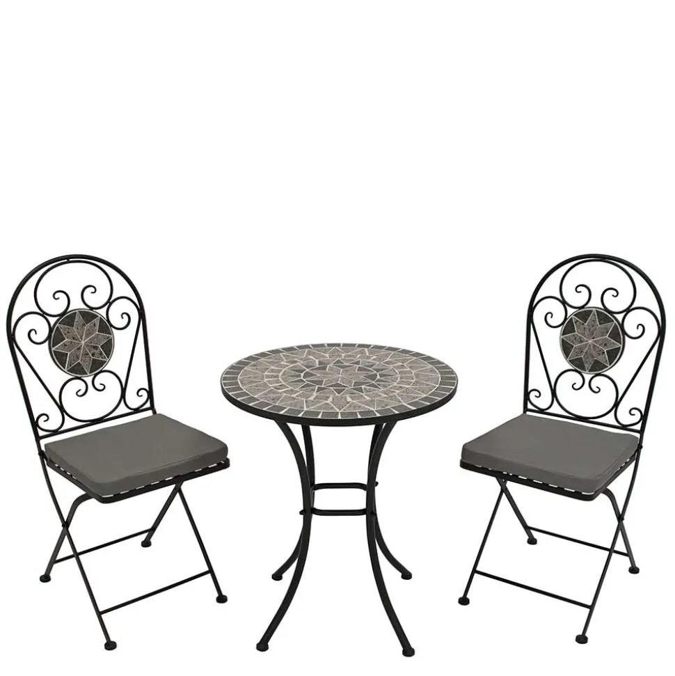 Die Tischgruppe „Tasmania“ überzeugt durch eine sorgfältige Materialauswahl, die sowohl Ästhetik als auch Langlebigkeit garantiert. Der robuste Rahmen aus Eisen bietet maximale Stabilität und Widerstandsfähigkeit, während die Tischplatte mit hochwertigen Keramikfliesen in kunstvoller Mosaik-Optik begeistert. Ein eingefasster Metallrand sorgt für zusätzliche Eleganz und Schutz. Die Sitzflächen sind mit einem strapazierfähigen Webstoff aus 100 % Polyester bezogen – abnehmbar und waschbar für eine besonders einfache Pflege.