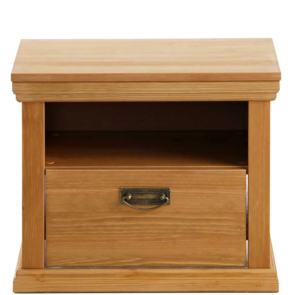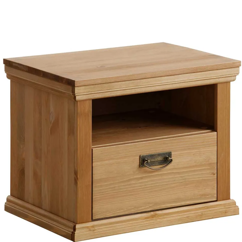 Mit den Maßen von 52 cm Breite, 40 cm Höhe und 37 cm Tiefe fügt sich die Nachtkommode „Inhusa“ perfekt in jede Raumsituation ein. Trotz ihrer kompakten Größe überzeugt sie mit viel Stauraum. Das offene Fach bietet den idealen Ort für Ihre Abendlektüre oder andere Gegenstände, die Sie gerne griffbereit haben möchten. Zusätzlich verfügt die Kommode über eine geräumige Schublade mit stabilem Metallauszug, die durch einen nostalgisch anmutenden Klappgriff in Altmessingfarben geöffnet wird.