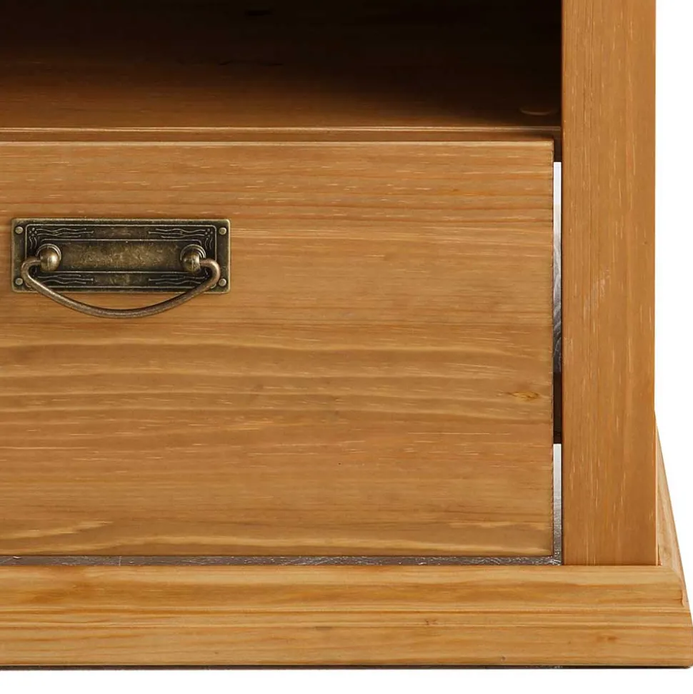 Die Oberfläche der Nachtkommode wurde sorgfältig gebeizt und geölt. Dieses Verfahren intensiviert nicht nur die natürliche Maserung des Kiefernholzes, sondern sorgt auch für einen effektiven Schutz. Das Ölen bewahrt das Holz vor dem Austrocknen, hält es geschmeidig und unterstreicht seine natürliche Schönheit.