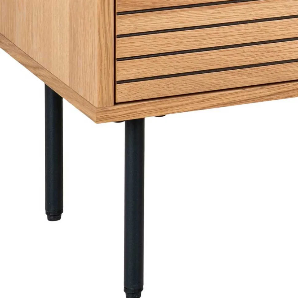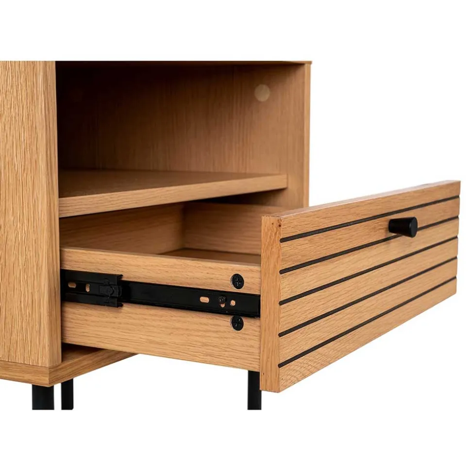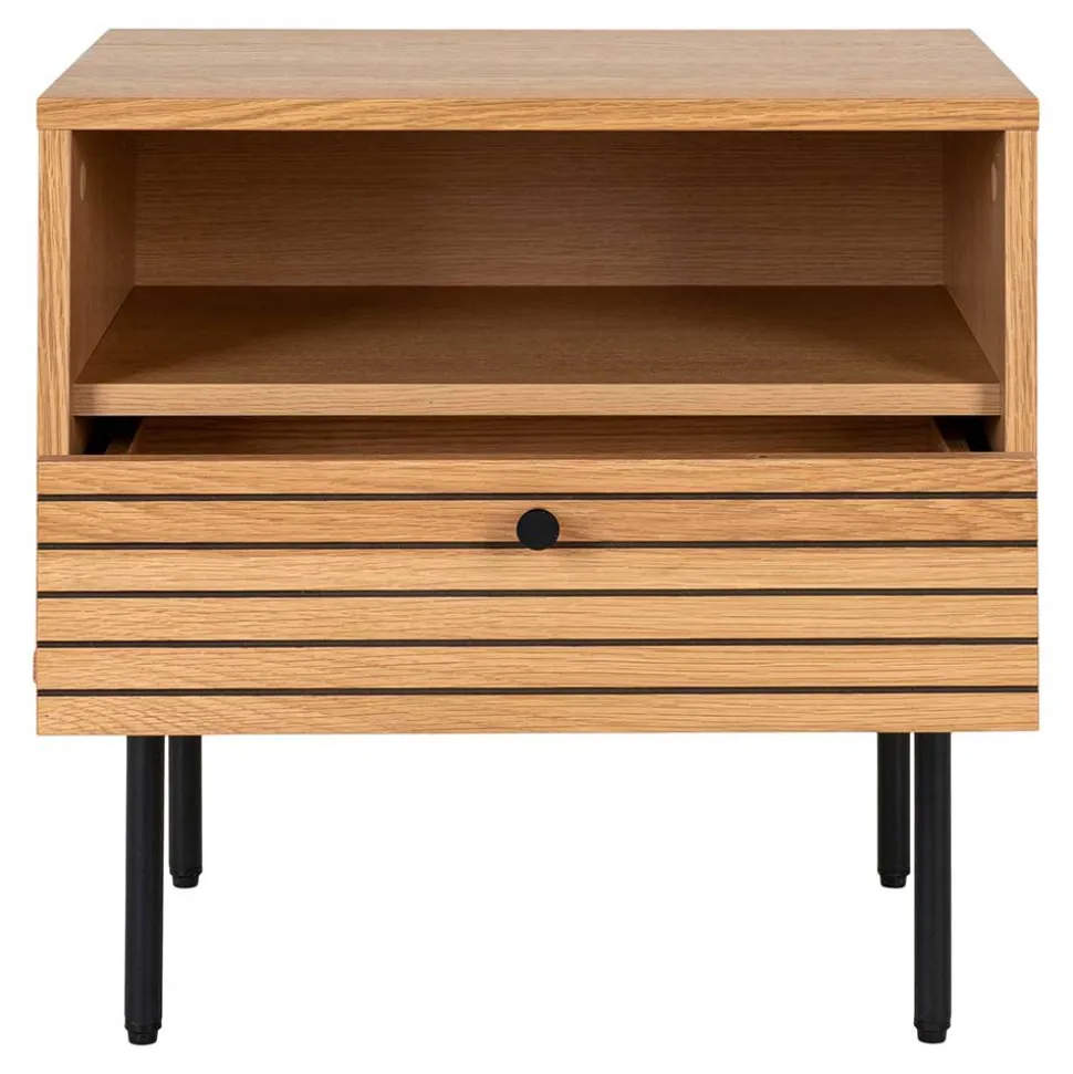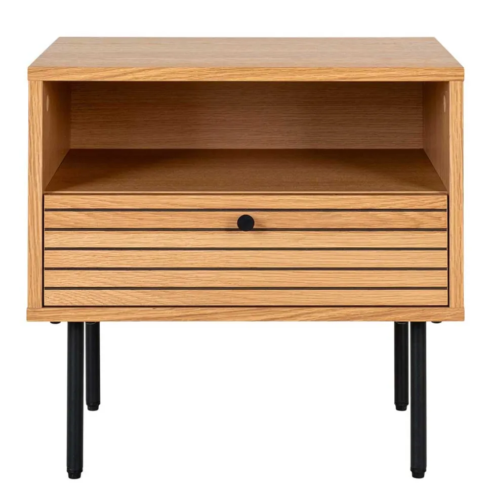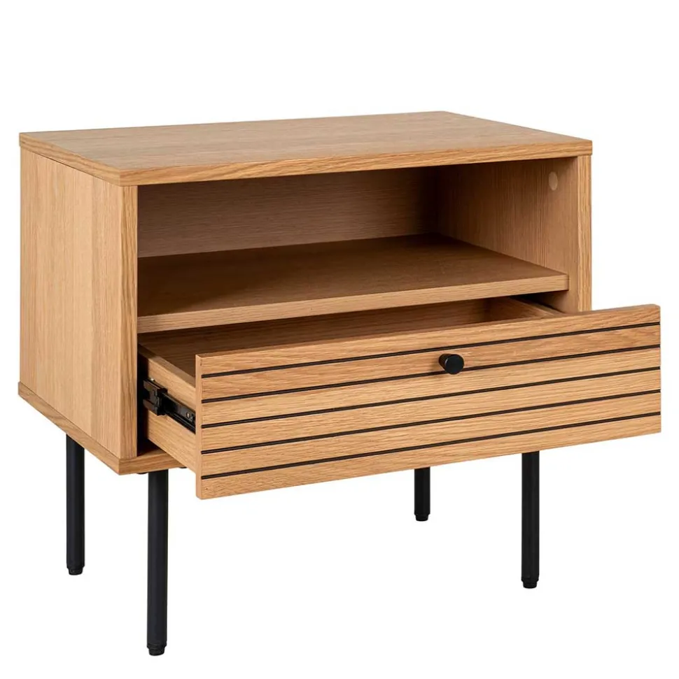 Die Nachtkommode „Virona“ bietet Ihnen ein offenes Fach sowie eine Schublade, die mit hochwertigen Metallauszügen ausgestattet ist. Die Schubladenfront beeindruckt durch dekorative, schwarze Rillen mit horizontalem Verlauf und sorgt für einen ansprechenden visuellen Effekt. Diese funktionalen Details ermöglichen eine durchdachte Aufbewahrung, die sowohl praktisch als auch stilvoll ist.