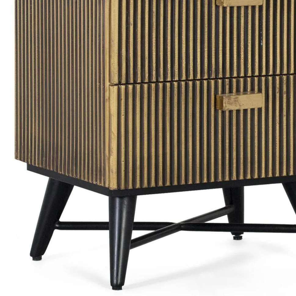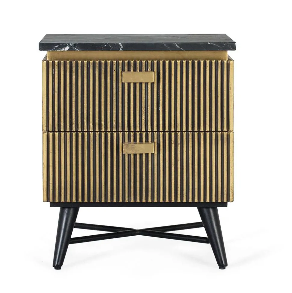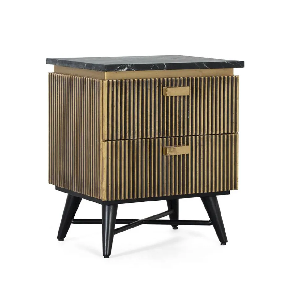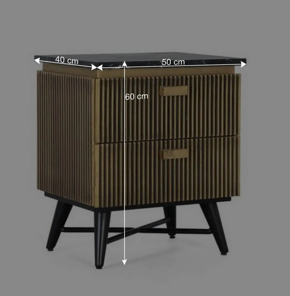 Die Nachtkommode „Hayato“ beeindruckt durch die Verwendung erstklassiger Materialien. Die Deckplatte besteht aus edlem schwarzem Marmor, der nicht nur robust, sondern auch besonders stilvoll ist. Das Korpusmaterial aus massivem Mangoholz sorgt für Stabilität und eine natürliche Ausstrahlung. Die Oberfläche ist lackiert, um die natürliche Schönheit des Holzes zu unterstreichen und gleichzeitig langlebig zu machen. Das schwarz lackierte Metalluntergestell mit seinen konisch zulaufenden Beinen verleiht der Kommode eine filigrane Leichtigkeit, während bronzefarbene, rechteckige Griffe und ein plastisches Rillenmuster den eleganten Retro-Look abrunden.