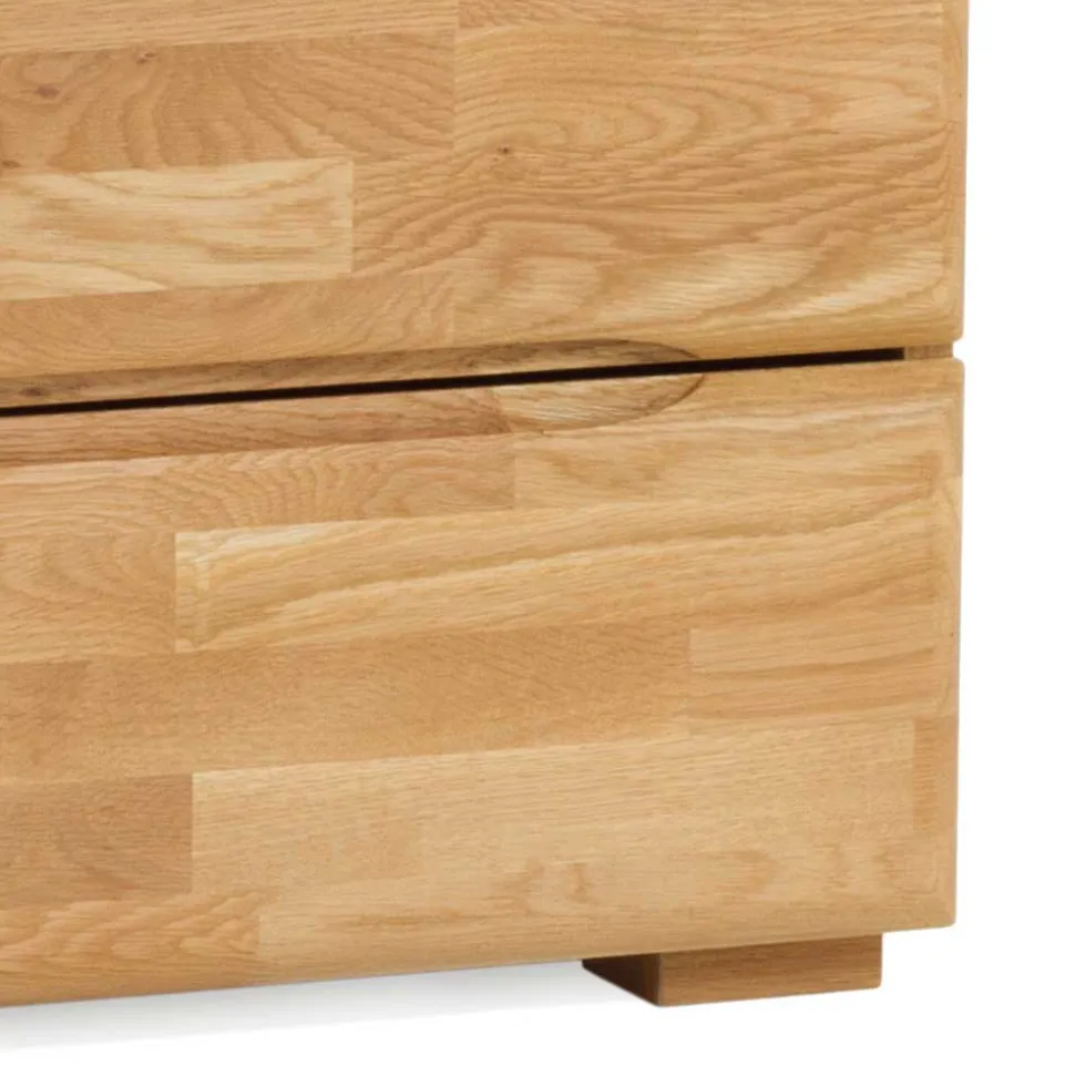 Die sorgfältige Veredelung der Oberfläche mit einem honigfarbenen Öl hebt nicht nur die natürliche Maserung und Farbe der Wildeiche hervor, sondern schützt das Holz auch effektiv vor Abnutzung. Diese Ölung erleichtert die Pflege der Nachtkonsole und bewahrt ihre Schönheit über Jahre hinweg. Zudem unterstützt das natürliche Holz ein gesundes Raumklima und sorgt für eine wohlige Atmosphäre in Ihrem Schlafbereich.