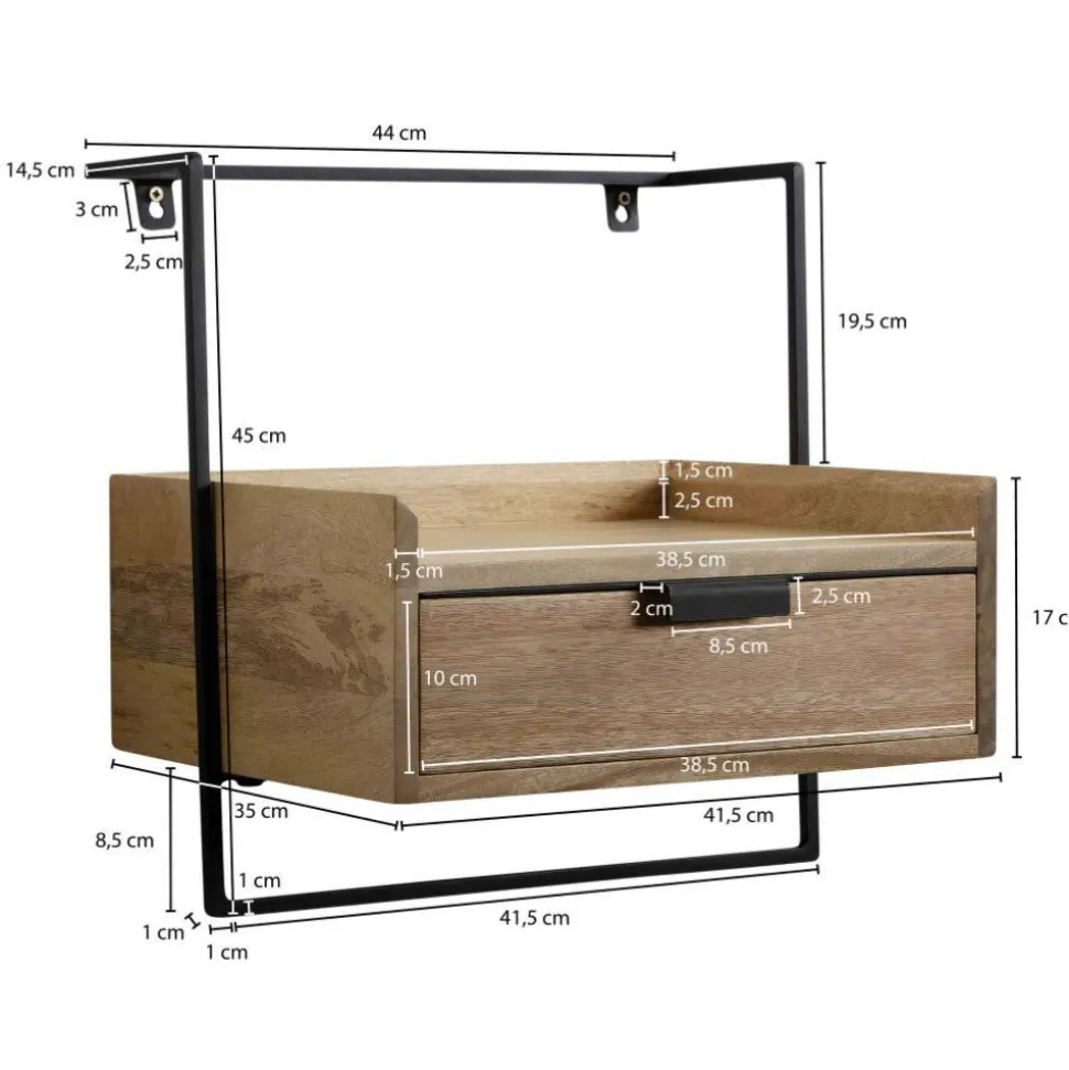 Die Nachtkonsole „Hanniba“ wird aus edlem Mangobaum Massivholz und robustem Metall gefertigt. Das Mangoholz besticht durch seine natürliche Maserung, die jedem Stück eine individuelle Note verleiht. Zudem sind die Oberflächen lackiert, wodurch sie nicht nur pflegeleicht, sondern auch widerstandsfähig sind. Das schwarze Eisen-Rahmengestell mit integrierter Wandhalterung ergänzt die Konstruktion und sorgt für Stabilität sowie eine moderne Ausstrahlung. Die Schublade ist mit einem Holzauszug und einem eleganten Metallkantengriff ausgestattet, der den Kontrast zwischen den Materialien harmonisch unterstreicht.