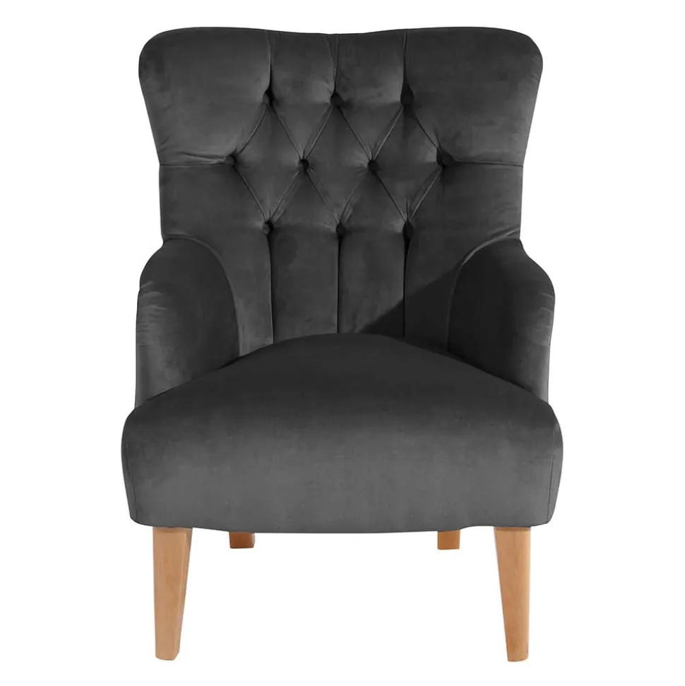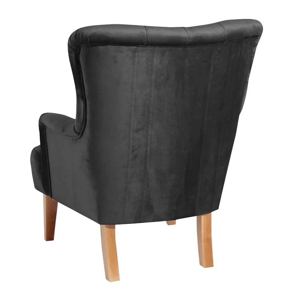 Der Ohrenbackensessel „Camcupa“ präsentiert sich in einem ansprechenden Anthrazitton, der perfekt mit den natürlichen Buche-Holzbeinen harmoniert. Sein tolles Vintage-Design mit modernem Chic und tiefen Steppungen sowie Knopfheftungen verleiht ihm eine besonders dekorative Note.