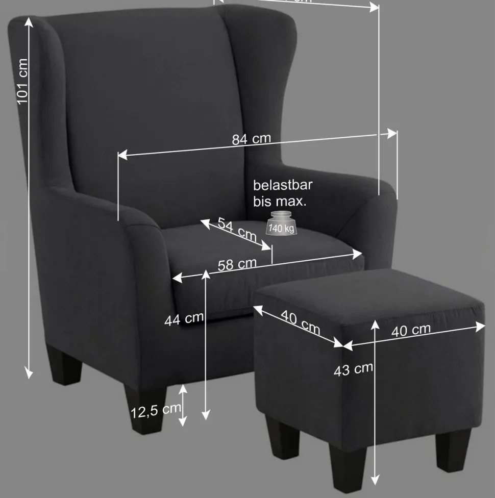 Die großzügige Rückenlehne mit ihren charmanten seitlichen Ohren vermittelt Geborgenheit und schafft ein geschütztes, kuscheliges Sitzgefühl. Mit einer Sitzbreite von 58 cm und einer Sitztiefe von 54 cm bietet der Sessel ausreichend Platz, um sich entspannt zurückzulehnen. Die angenehme Sitzhöhe von 44 cm erleichtert das Aufstehen, während die Armlehnen in 57 cm Höhe die perfekte Unterstützung für Arme und Schultern bieten.