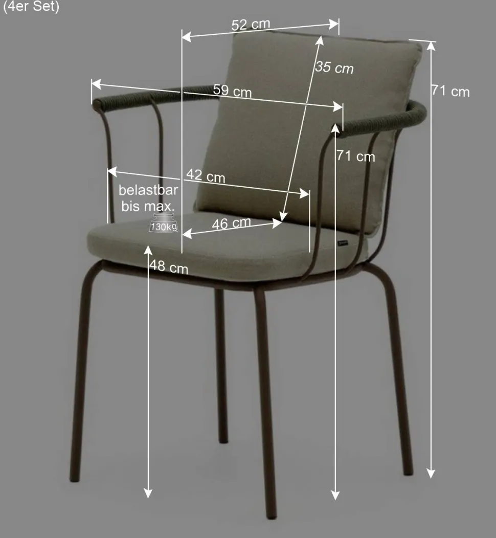 Dieses Set besteht aus vier Stühlen, die sich ideal für den Einsatz in Ihrem Esszimmer, auf Ihrer Terrasse oder in Ihrem Wohnzimmer eignen. Die Möglichkeit, vier Stühle im Set zu erhalten, bietet Ihnen Flexibilität bei der Gestaltung Ihres Raumes und ermöglicht es Ihnen, bei Bedarf zusätzliche Sitzgelegenheiten bereitzustellen.