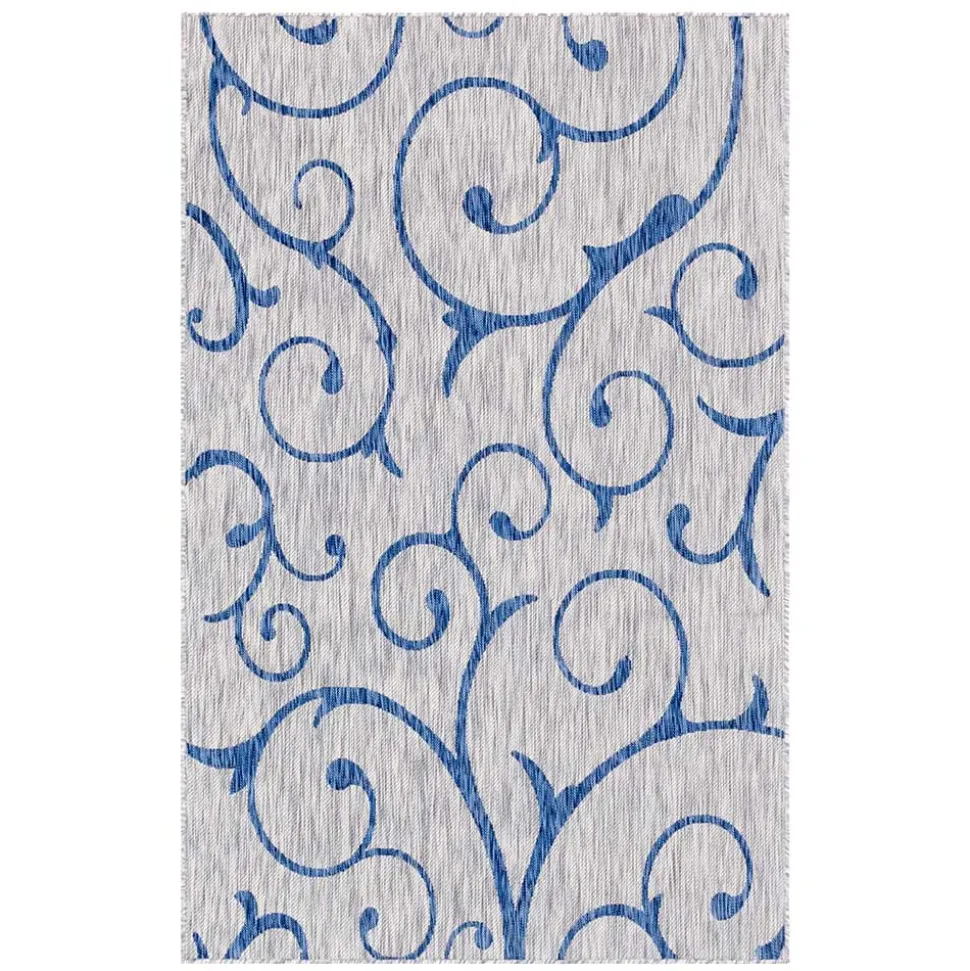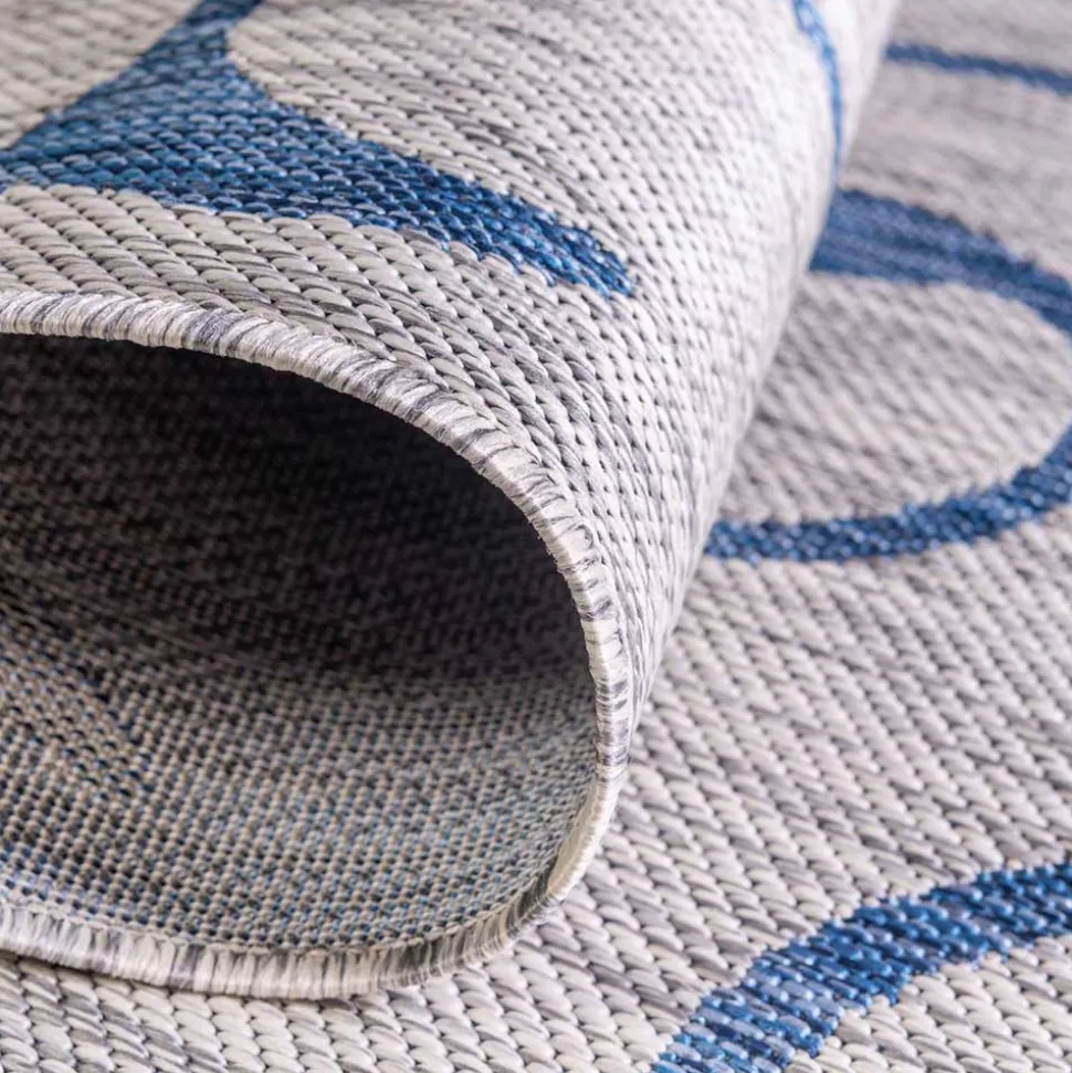 Der Outdoor Webteppich aus PP „Elsaro“ bringt mit seinem hellgrauen Grund und der großflächigen Ornament-Musterung in Blau eine luftige Eleganz in Ihre Wohn- und Außenbereiche. Das Design wirkt wie eine moderne Interpretation klassischer Fliesenmotive und entfaltet seine Wirkung besonders gut in offenen Raumkonzepten – ob auf der Terrasse, im Wintergarten oder im Wohnzimmer. Die kühle Farbgebung sorgt für Klarheit und Ruhe, während das Muster dekorative Tiefe verleiht.