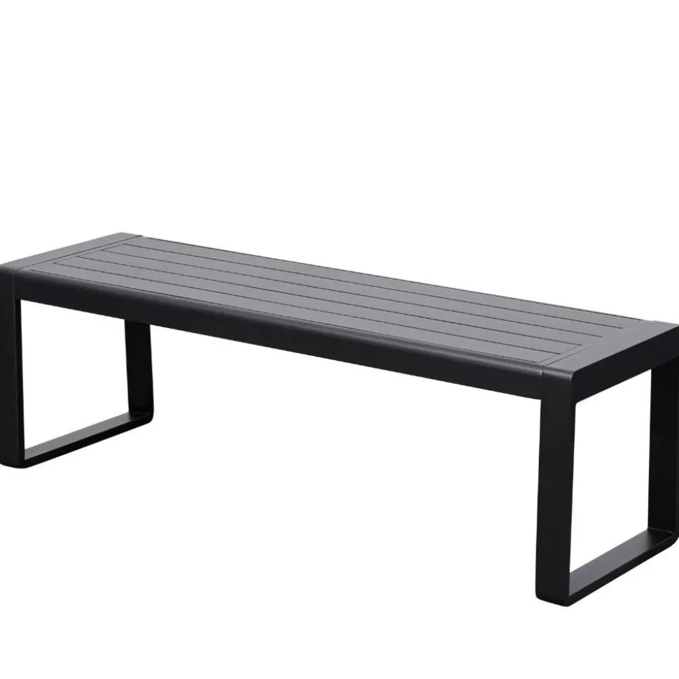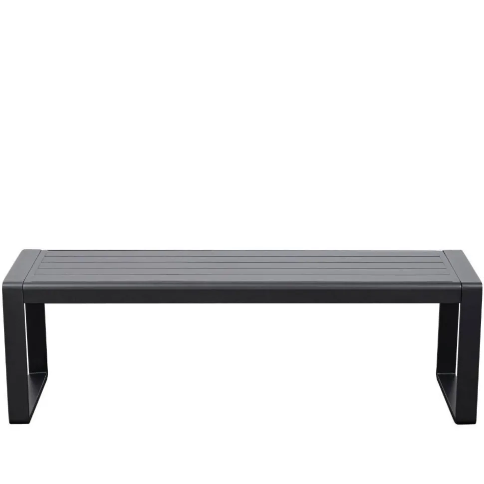 Gefertigt aus pulverbeschichtetem Aluminium bietet die Bank robuste Stabilität und ist zugleich wetterbeständig. Das Bügelgestell mit Kufen (jeweils ca. 6 x 2 cm) sorgt für sicheren Stand, während die Sitzfläche aus schmalen Leisten (7 x 0,7 cm) clever konzipiert ist: Durch die offenen Zwischenräume kann Regenwasser einfach ablaufen – Staunässe gehört der Vergangenheit an.