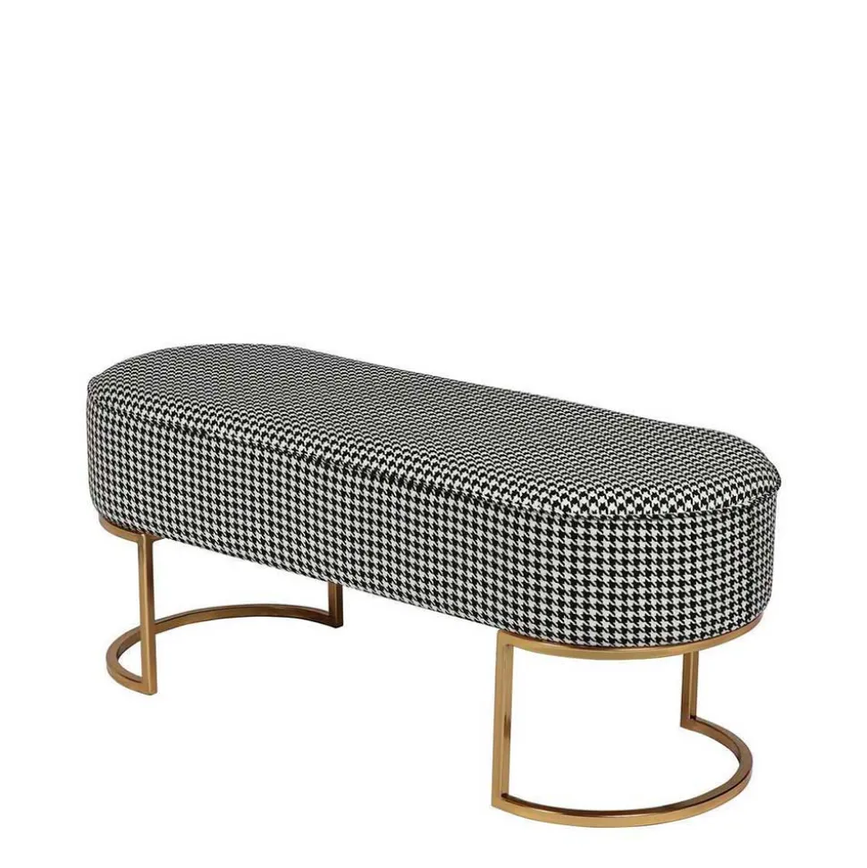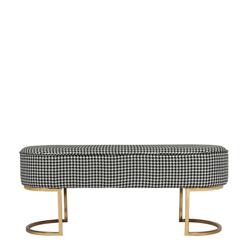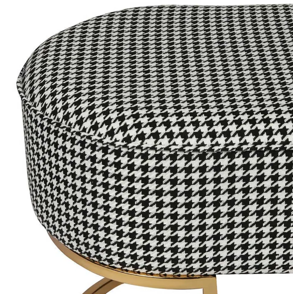 Die harmonische Kombination aus Schwarz, Weiß und goldfarbenen Akzenten sorgt für ein extravagantes, dabei aber geschmackvolles Erscheinungsbild. Besonders das klassische Hahnentritt-Muster des Bezugs sticht ins Auge – ein absolutes Designhighlight, das sowohl modische als auch wohnliche Eleganz ausstrahlt. Der hochwertige Webstoff aus 100 % Polyester überzeugt durch seine Strapazierfähigkeit und Langlebigkeit, ist dabei pflegeleicht und angenehm auf der Haut. Ergänzt wird das Ganze durch das halbrunde, stabile Bügelgestell aus goldfarbenem Metall – eine perfekte Balance aus Stabilität und Stil, die Ihrer Einrichtung einen Hauch von Glamour verleiht.
