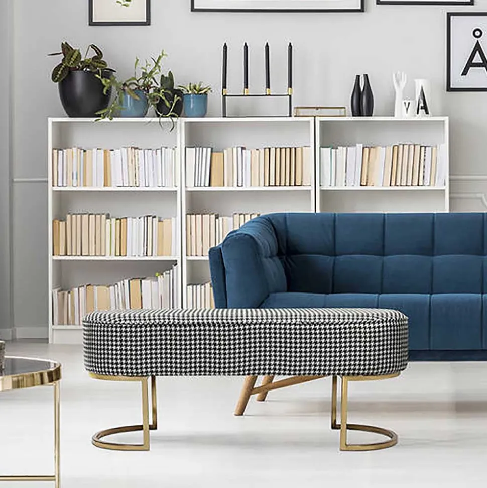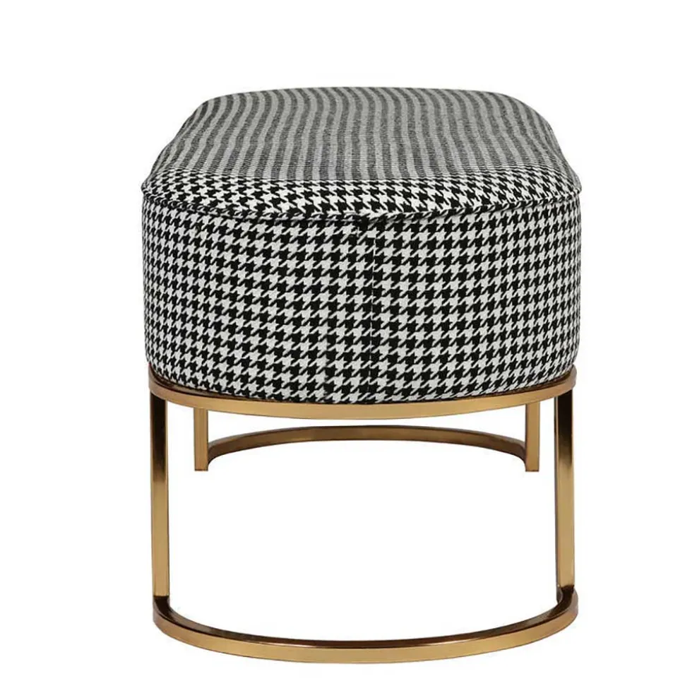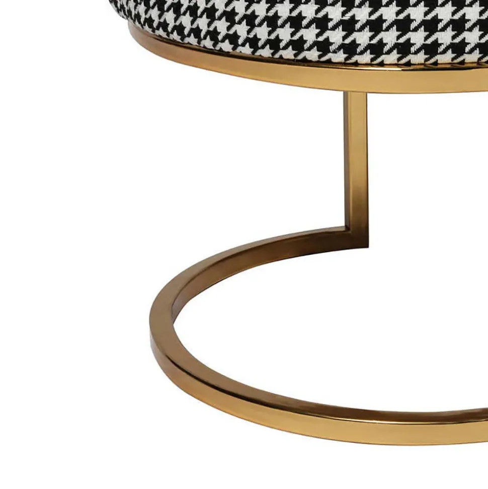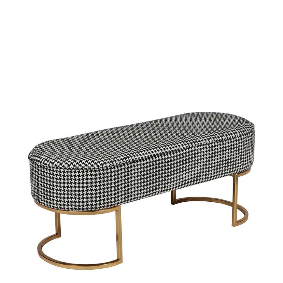 Die harmonische Kombination aus Schwarz, Weiß und goldfarbenen Akzenten sorgt für ein extravagantes, dabei aber geschmackvolles Erscheinungsbild. Besonders das klassische Hahnentritt-Muster des Bezugs sticht ins Auge – ein absolutes Designhighlight, das sowohl modische als auch wohnliche Eleganz ausstrahlt. Der hochwertige Webstoff aus 100 % Polyester überzeugt durch seine Strapazierfähigkeit und Langlebigkeit, ist dabei pflegeleicht und angenehm auf der Haut. Ergänzt wird das Ganze durch das halbrunde, stabile Bügelgestell aus goldfarbenem Metall – eine perfekte Balance aus Stabilität und Stil, die Ihrer Einrichtung einen Hauch von Glamour verleiht.