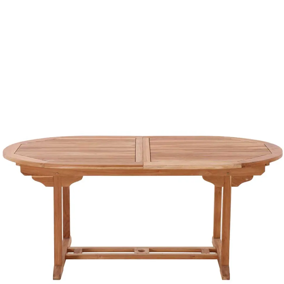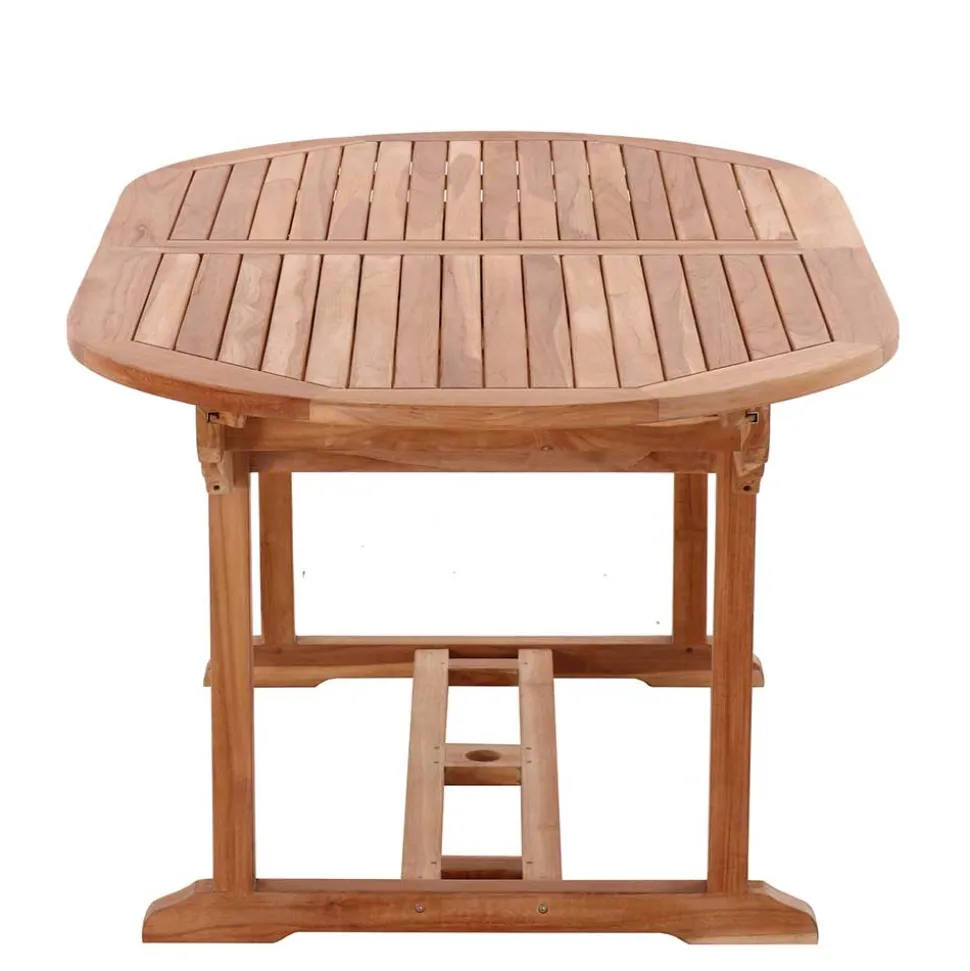 - Platte aus Massivholzlatten, im Auszug eine Öffnung für den Sonnenschirm (Durchmesser ca. 5 cm)