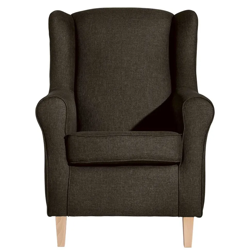 Das stabile Grundgestell aus Massivholz und Holzwerkstoffen sorgt für zuverlässige Standfestigkeit bei gleichzeitigem Sitzgenuss bis zu 120 kg. Der aufwendig gearbeitete Bezug mit umlaufenden Kedernähten sowie der echt bezogene Rücken unterstreichen den hohen Qualitätsanspruch dieses Möbelstücks. Schön geschwungene Armlehnen und gemütliche, seitliche Ohren laden dazu ein, sich einzukuscheln und den Alltag draußen zu lassen.