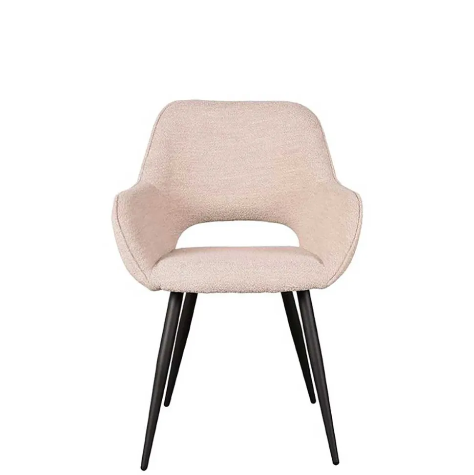 Bezogen ist der Stuhl mit einem hochwertigen Bouclé-Stoff aus 100 % Polyester, dessen feine Struktur ein Gefühl von Behaglichkeit und Raffinesse vermittelt. Die helle Beige-Nuance unterstreicht den skandinavischen Stil und harmoniert wunderbar mit verschiedensten Farbkonzepten. Der Stoff ist strapazierfähig, pflegeleicht und fühlt sich angenehm weich an – ideal für den täglichen Einsatz und dennoch besonders.