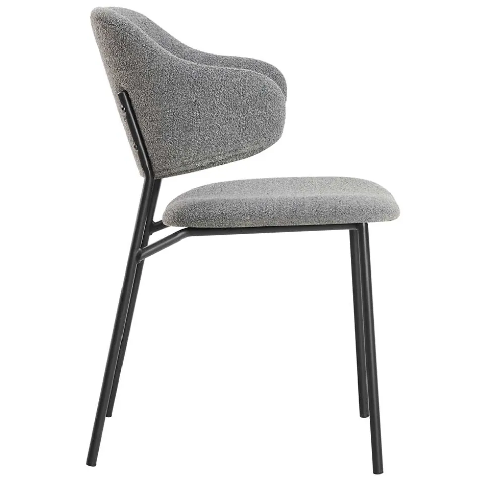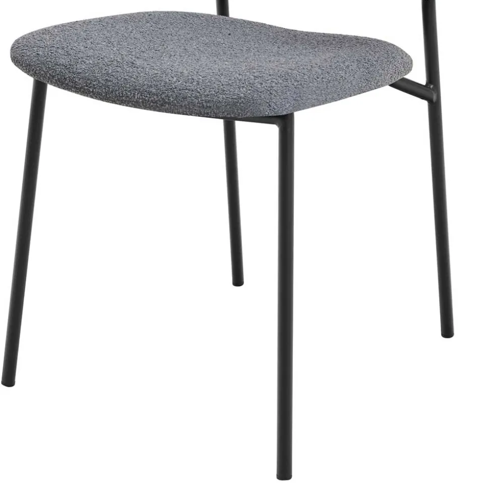 Der Bezug besteht aus edlem Bouclé-Stoff, der mit seiner weichen, strukturierten Oberfläche eine besondere Haptik bietet. Gefertigt aus 100 % Polyester, ist das Material nicht nur angenehm im Sitzgefühl, sondern auch äußerst strapazierfähig – mit einer Scheuerbeständigkeit von 35.000 Touren nach Martindale. Die Sitzfläche und Rückenlehne sind mit einer hochwertigen Schaumstoffpolsterung ausgestattet, die optimalen Komfort verspricht. Das schwarz pulverbeschichtete Metallgestell sorgt für Stabilität und unterstreicht den modernen Look der Stühle.
