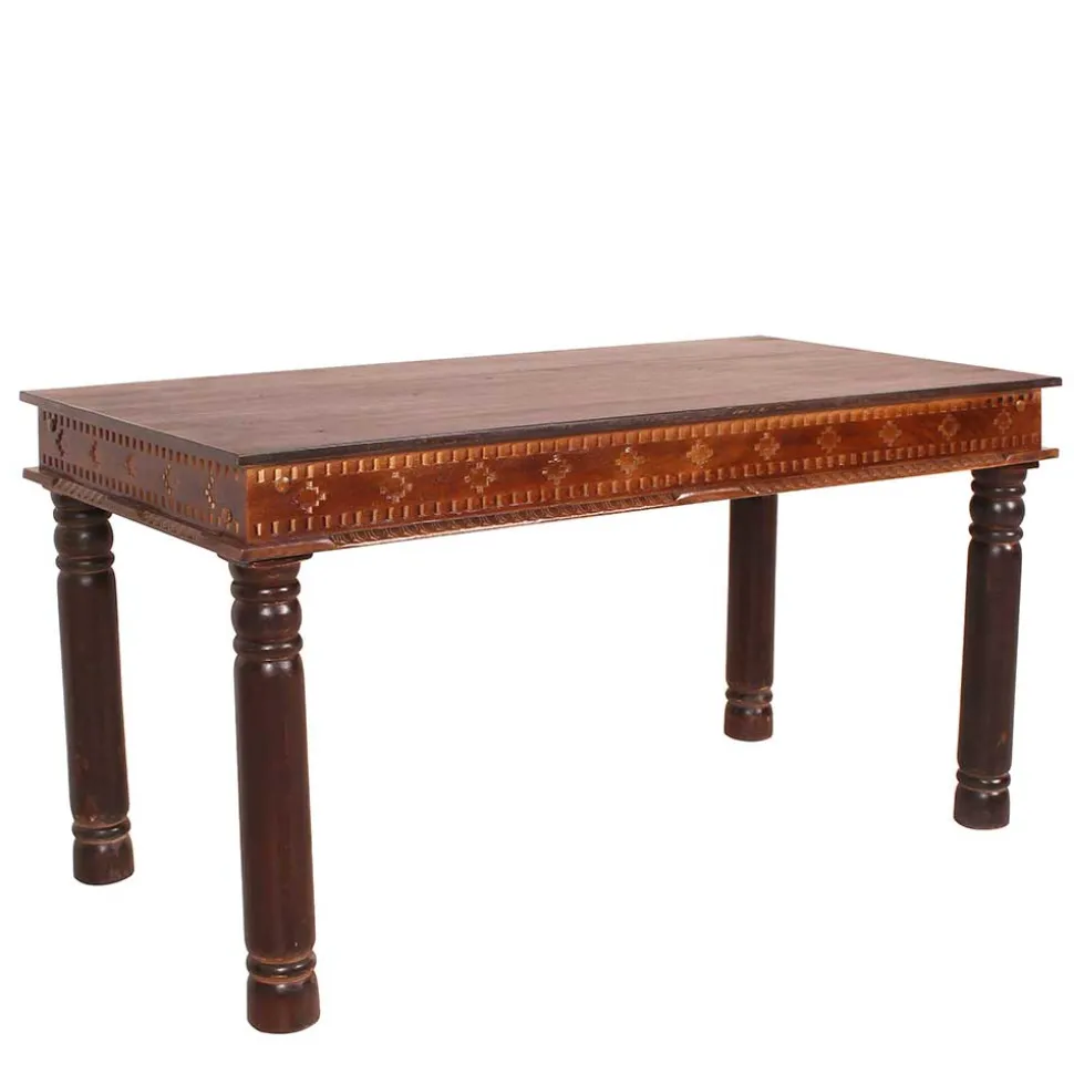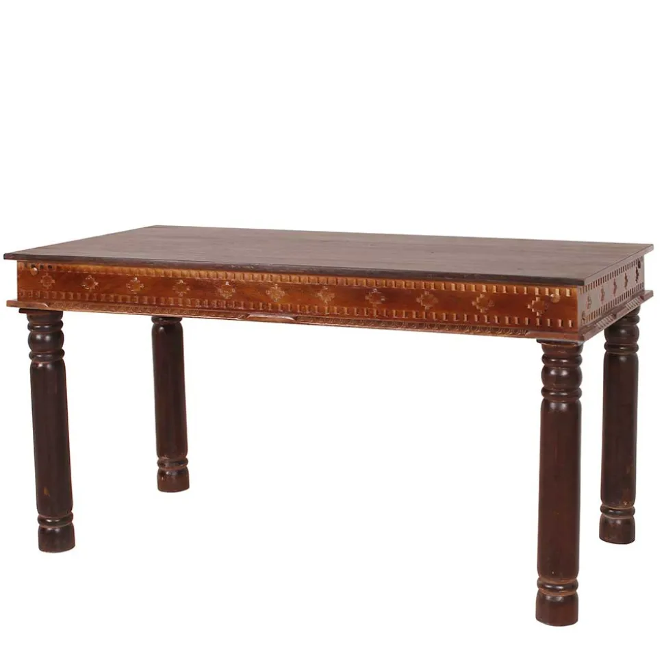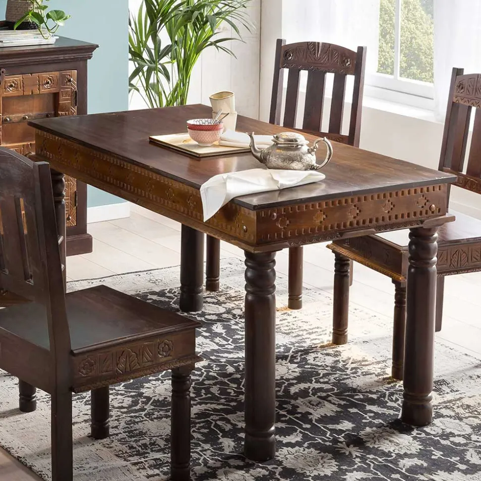 Ein Blick genügt, und Sie werden vom Esstisch „Solapura“ verzaubert sein. Inspiriert von der opulenten Ästhetik des indischen Kolonialstils, verbindet dieses Möbelstück traditionelle Handwerkskunst mit einer Prise Exotik. Der indische Kolonialstil zeichnet sich durch die Verschmelzung europäischer Formen mit indischen Materialien und Verzierungen aus, und genau diese Fusion macht den „Solapura“ zu etwas ganz Besonderem.