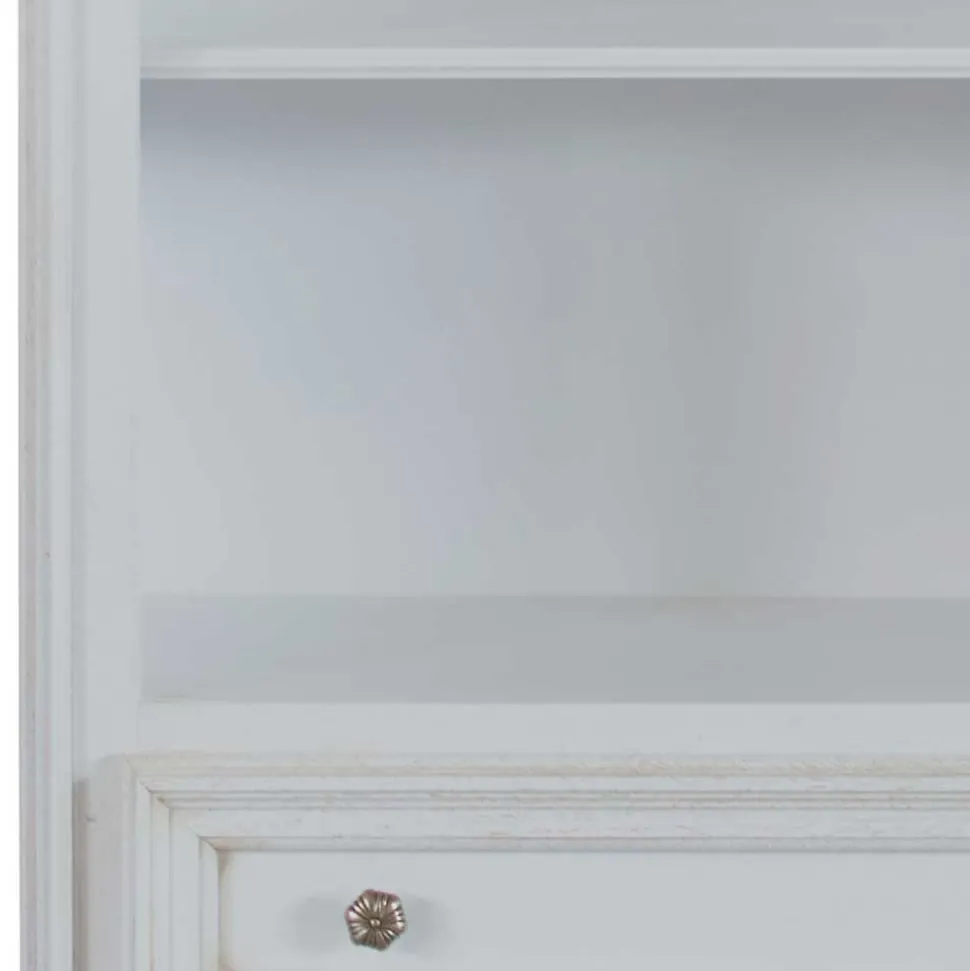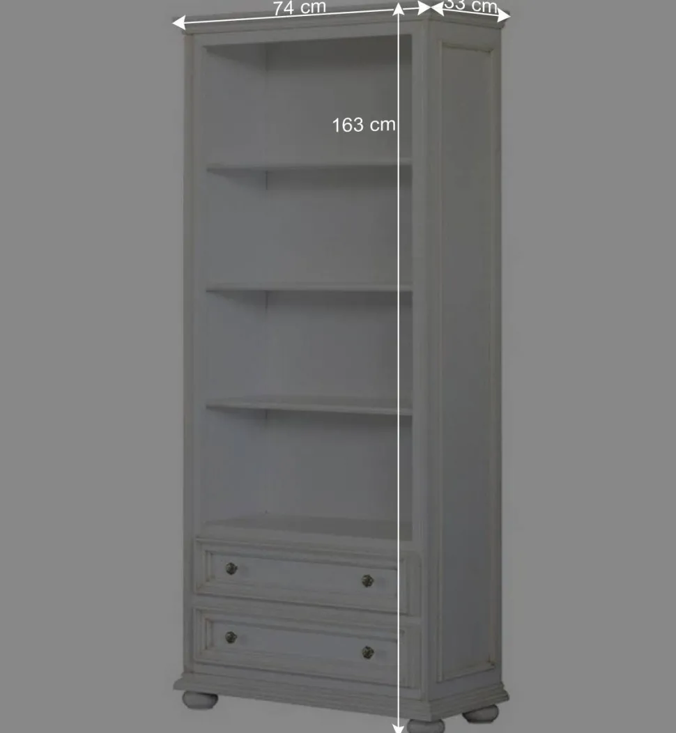 Mit seinem antikweißen Finish und der stilvollen Formgebung fügt sich das Regal „Vicina“ harmonisch in klassische Wohnkonzepte ein. Es bietet eine ideale Möglichkeit, Bücher, Sammlerobjekte oder dekorative Accessoires geschmackvoll zu präsentieren.