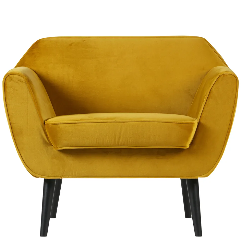 Das konisch zulaufende, schräg gestellte Vierfußgestell aus Birkenholz, in Schwarz lackiert, verleiht dem Sessel nicht nur Stabilität, sondern auch einen stilvollen Look. Die Kombination aus dem warmen Ockerton des Bezugs und den dunklen Holzfüßen schafft einen faszinierenden Kontrast, der in jedem Raum für einen Hingucker sorgt.
