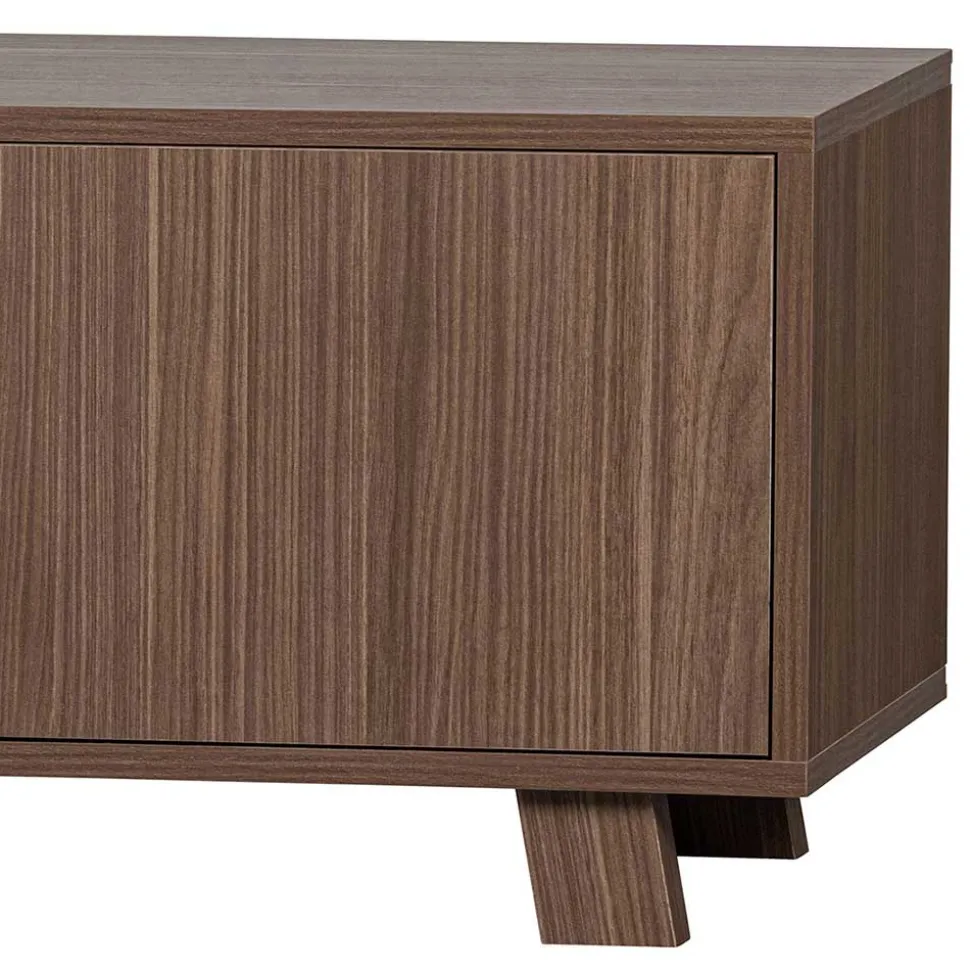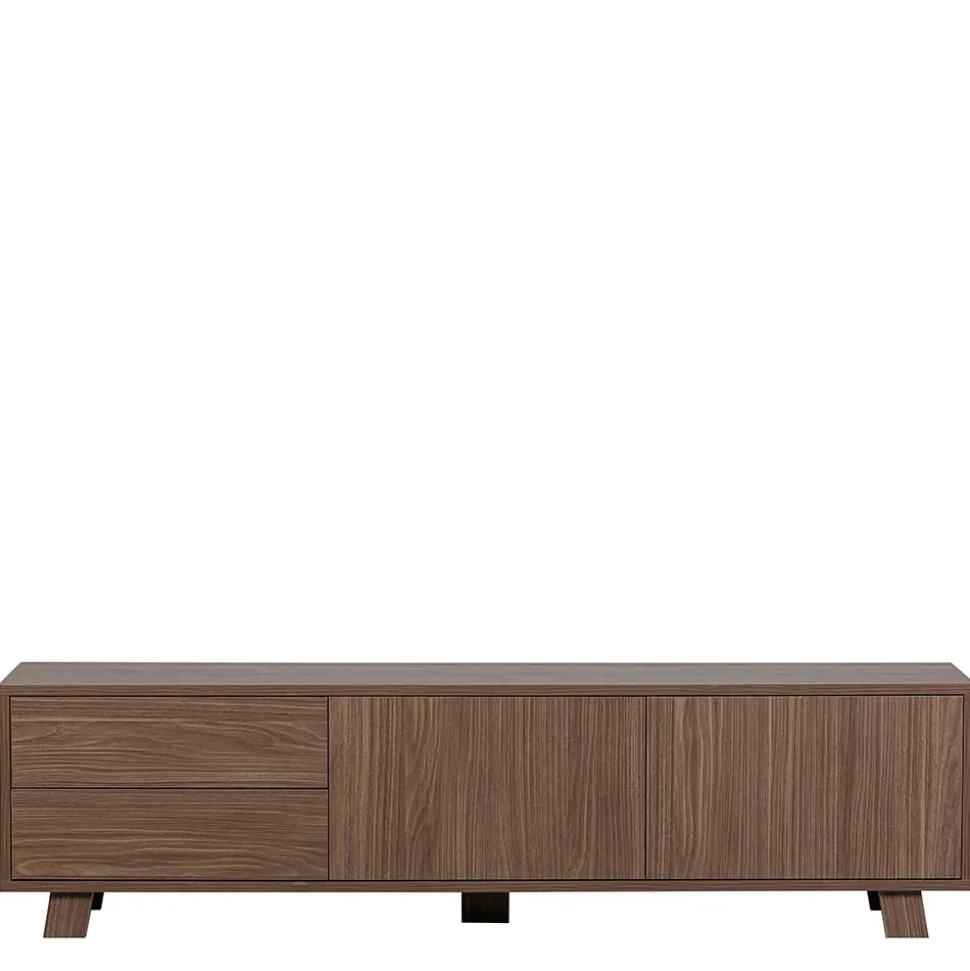Das TV Board ist aus Holzwerkstoff gefertigt und besticht mit einer charmanten Walnussoptik. Die Oberflächen sind furniert und transparent lackiert, wodurch die lebhafte Maserung besonders gut zur Geltung kommt. Ein Möbelstück, das nicht nur funktional, sondern auch optisch überzeugt.