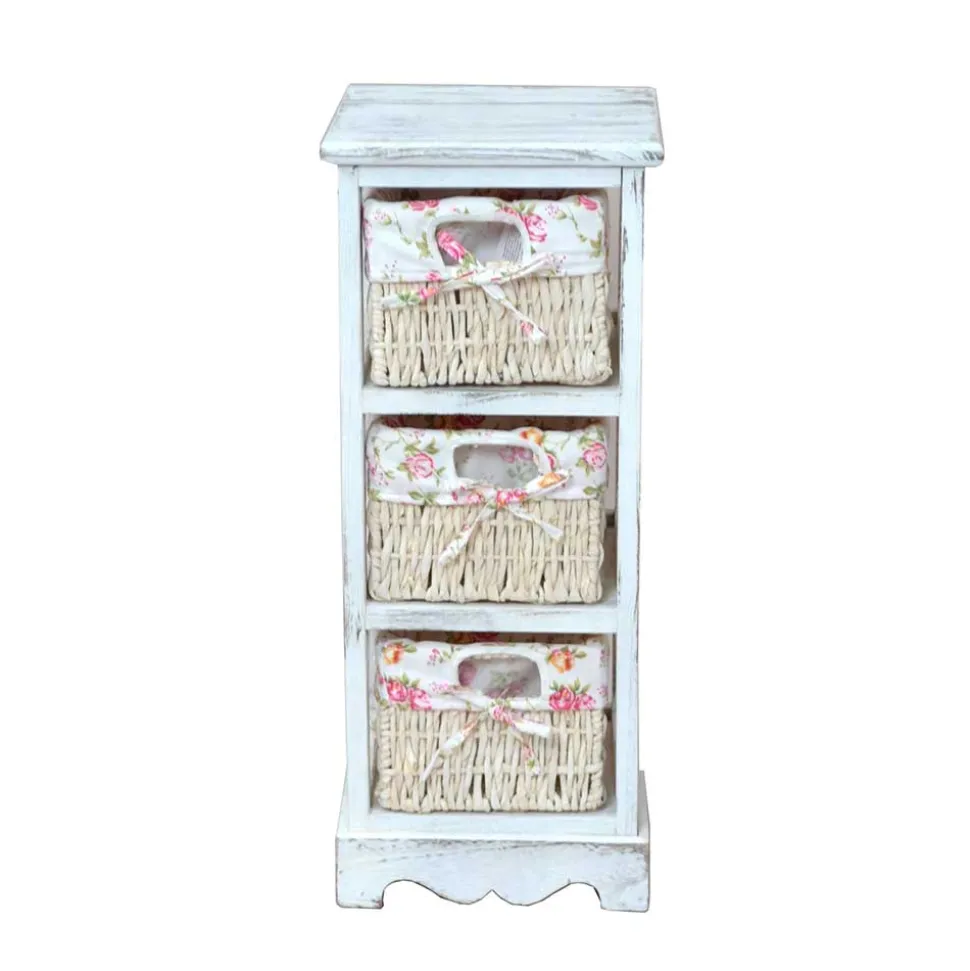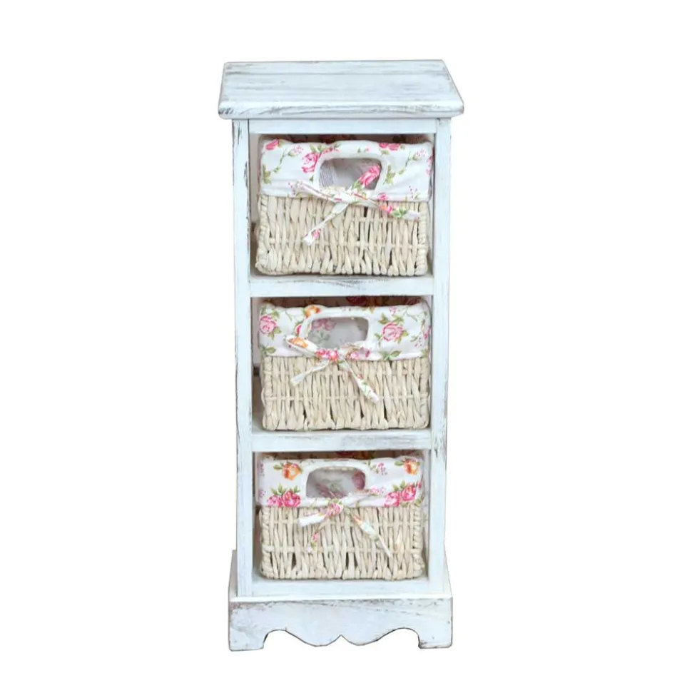 - Drei Körbe aus handgearbeitetem Maisgeflecht, nicht sichtbarem Eisenrahmen zur Stabilisierung, Stoffeinsatz im Rosendesign aus 80% Baumwolle und 20% Polyester
