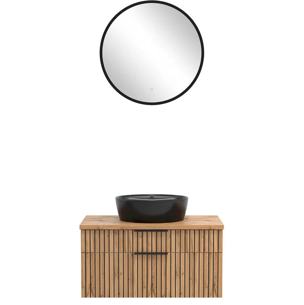 Gefertigt aus robuster Spanplatte mit melaminbeschichteter Oberfläche zeigt sich die Waschtisch-Kombination nicht nur optisch reizvoll, sondern auch funktional. Melamin sorgt für eine widerstandsfähige, kratzfeste und pflegeleichte Oberfläche – perfekt für den täglichen Einsatz im Badezimmer. Die Frontgestaltung in edler Rillenoptik verleiht dem Möbel ein fühlbares Designstatement, während der schwarze Hintergrund einen stimmigen Rahmen bildet. Der Spiegel aus hochwertigem Spiegelglas wird von einem runden, matt schwarz lackierten Metallrahmen eingefasst – stilvoll, stabil und voll im Trend.
