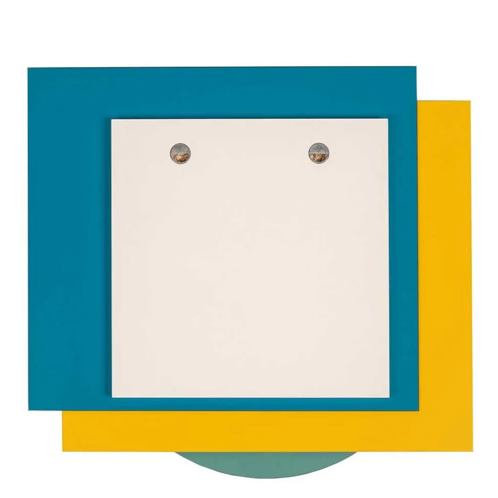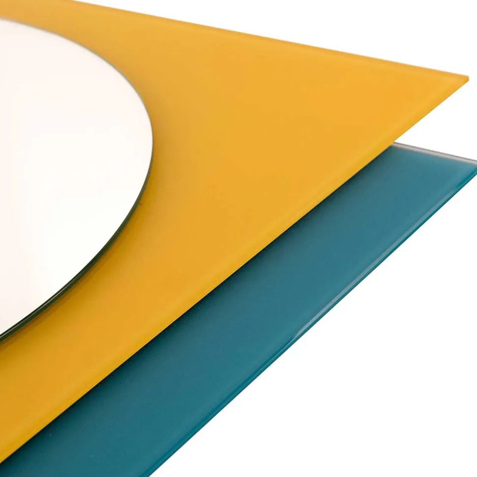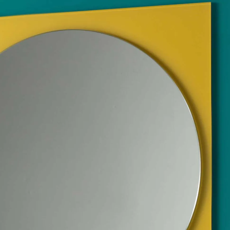 - Zwei versetzte Rechtecke aus Glas dienen als Rahmen für den runden Spiegel