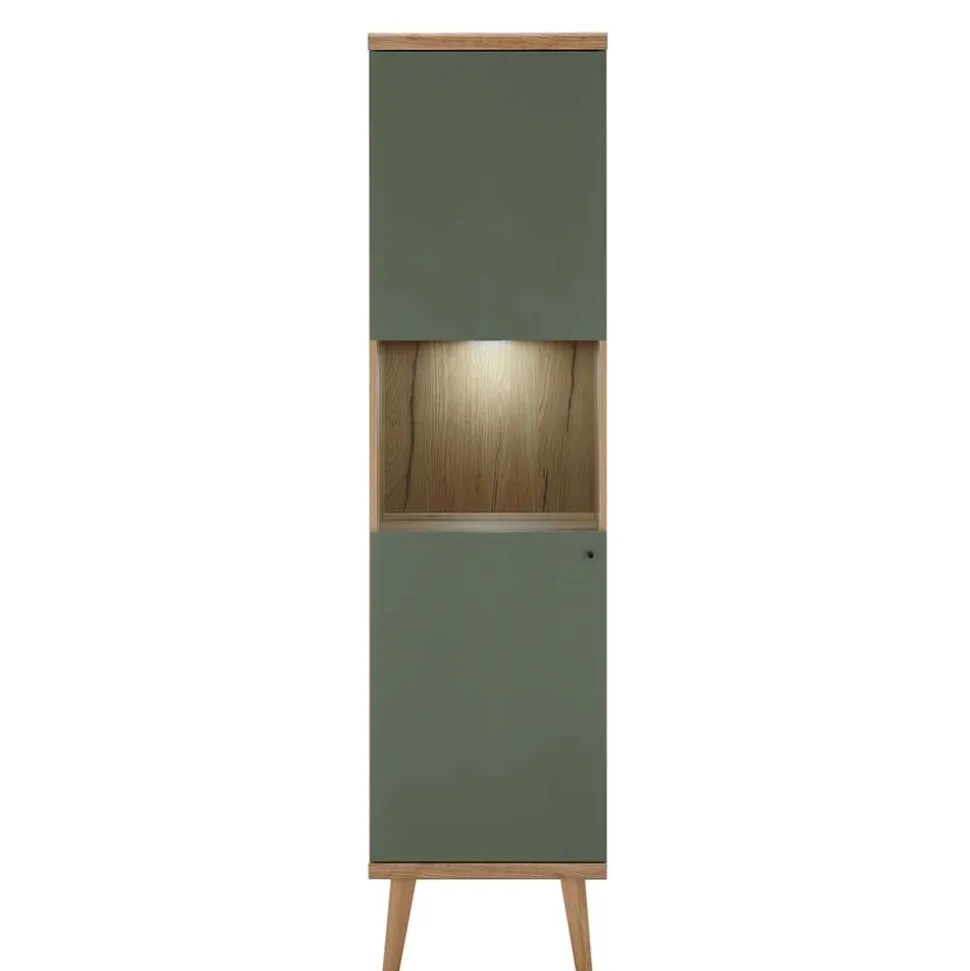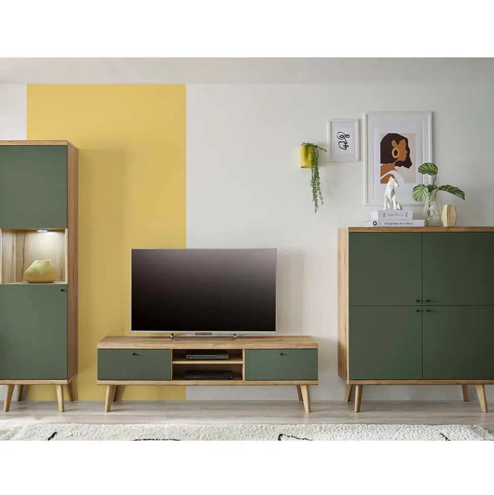 In der trendigen Farbkombination von Graugrün und Wildeichefarben setzt die Wohnwand „Oliva“ einen modernen Akzent. Die Holzwerkstoff-Oberflächen in Graugrün und die Massivholz-Elemente in Wildeichefarben vereinen sich zu einem harmonischen Gesamtbild. Holzwerkstoff, der für Korpusse und Fronten verwendet wird, bietet eine stabile und pflegeleichte Basis. Massivholz, das für die Vierfußgestelle verwendet wird, sorgt für Langlebigkeit und ein luxuriöses Gefühl. Beide Materialien sind nicht nur optisch ansprechend, sondern auch funktional durchdacht.