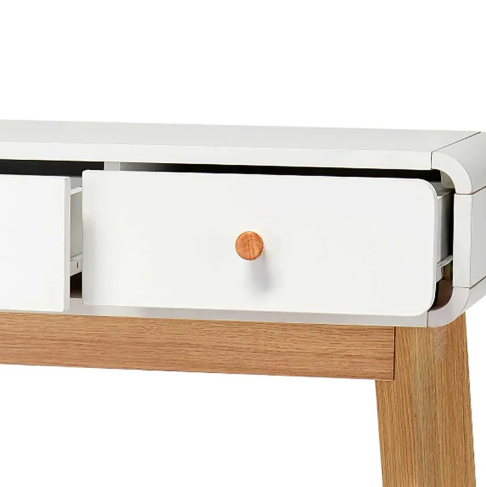 Dezent abgerundete Ecken verleihen dem Möbelstück eine sanfte Optik und sorgen für mehr Sicherheit – ideal auch für Haushalte mit Kindern. Die schräg gestellten Beine in Holzoptik-Eiche setzen einen warmen Kontrast zum strahlenden Weiß der Tischplatte und unterstreichen den skandinavischen Charme. Die runden Holz-Knopfgriffe fügen sich harmonisch ins Gesamtbild ein und sorgen für eine angenehme Haptik beim Öffnen der Schubladen.
