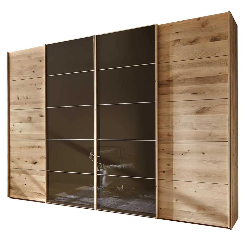 Die äußeren beiden Türfronten bestehen aus massivem Eichenholz, während die mittleren beiden Türfronten mit einem dunkelbraunen Glas beschichtet sind. Diese Kombination verleiht dem Schrank ein modernes und dennoch zeitloses Aussehen. Die langen Metallgriffleisten im passenden Korpusfarbton ergänzen das Design perfekt und erleichtern das Öffnen der Türen.