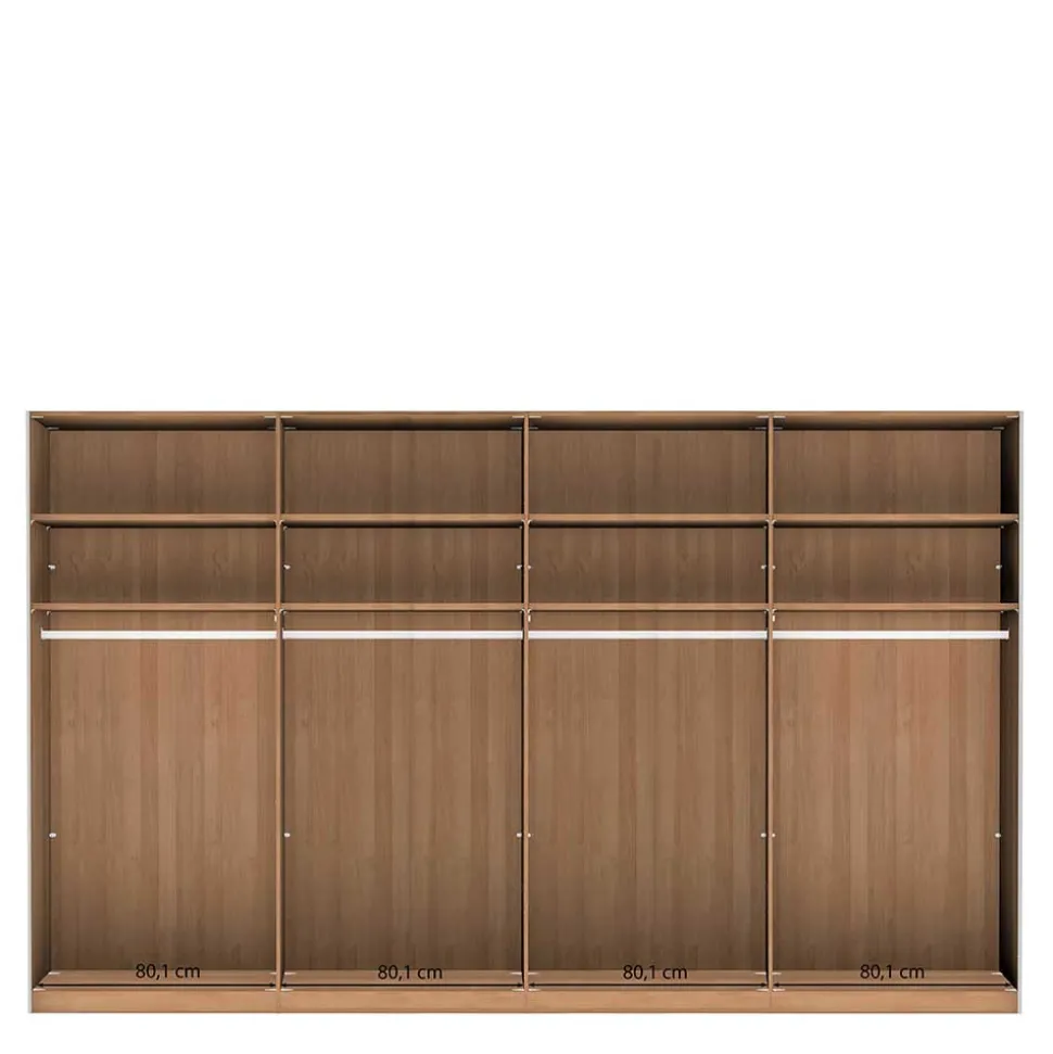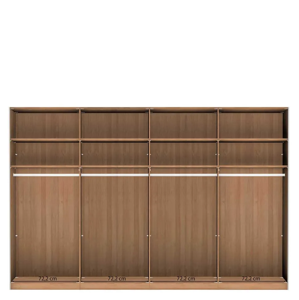 Hinter den eleganten Türen verbirgt sich ein durchdachter Stauraum mit extra viel Platz. Jede der vier Facheinheiten ist mit zwei Einlegeböden und einer Metall-Kleiderstange ausgestattet, was eine flexible und organisierte Aufbewahrung Ihrer Kleidung ermöglicht.