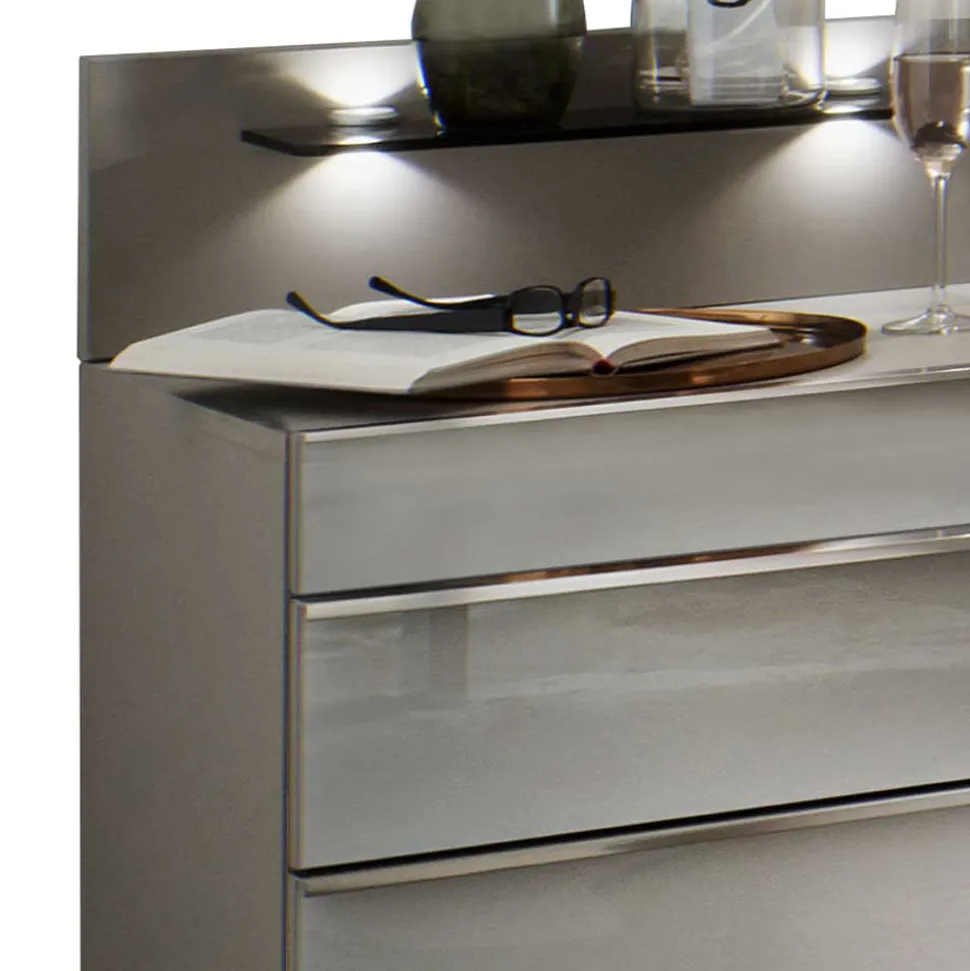 Der Falttüren-Kleiderschrank mit Passepartoutrahmen inklusive sechs LED-Leuchten ist nicht nur ein optisches Highlight, sondern bietet auch praktische Beleuchtungsmöglichkeiten. Alle Schubladen sind mit der Soft Close Funktion und Selbsteinzug ausgestattet, was ein sanftes und leises Schließen garantiert. Lange Griffleisten aus Metall nicht nur verschönern das Gesamtbild, sondern machen auch die Handhabung der Schubladen und Türen zum Kinderspiel. Die Nachtkommoden, ergänzt durch ein aufgesetztes Wandpaneel inklusive Rauchglasboden und LED Touch Beleuchtung, sowie das Doppelbett mit sparsamen LED-Flexleuchten am Kopfteil, setzen stimmungsvolle Akzente und sorgen für eine angenehme Atmosphäre.
