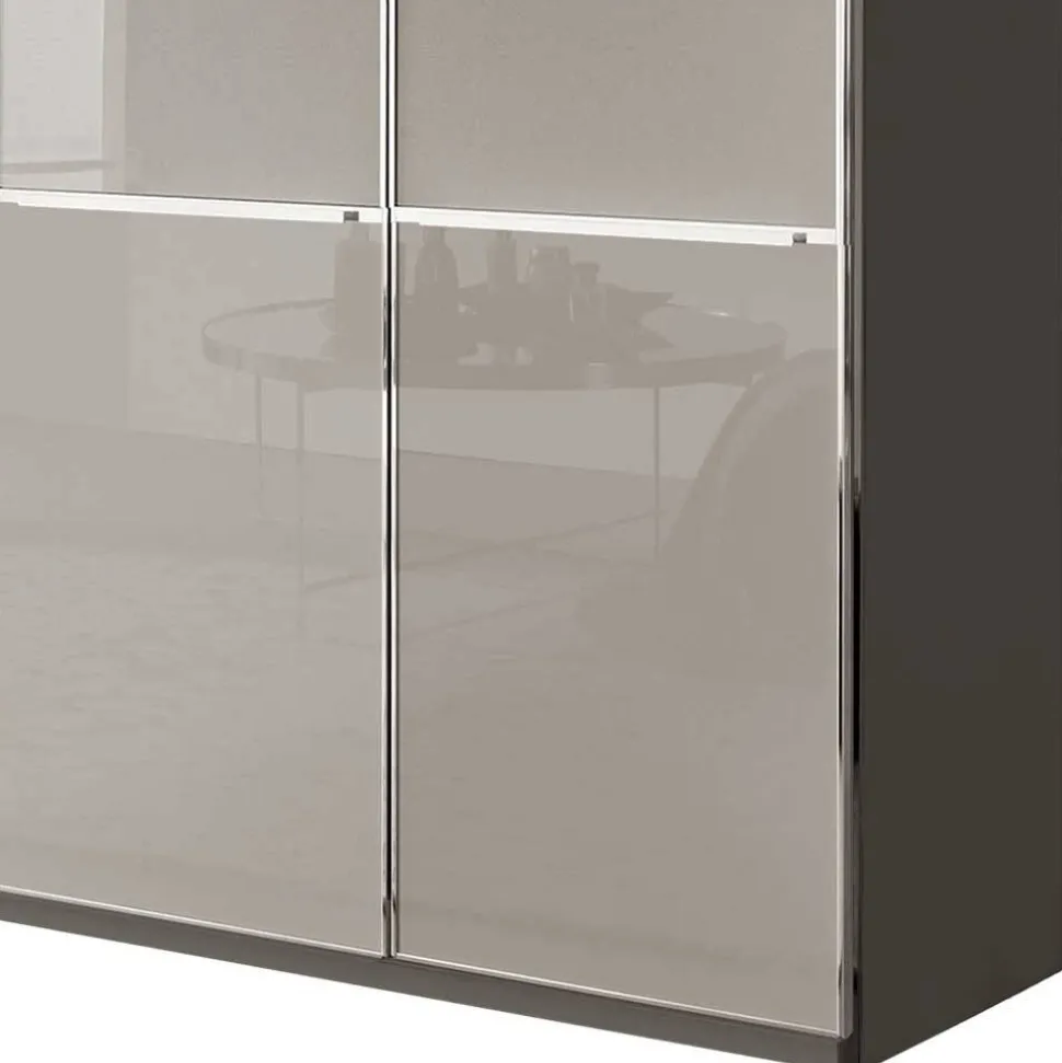 - Oberfläche der Front mit Glas in Hellgrau beschichtet, Korpus in Braun foliert, Innendekor Silber-Grau gestreift foliert